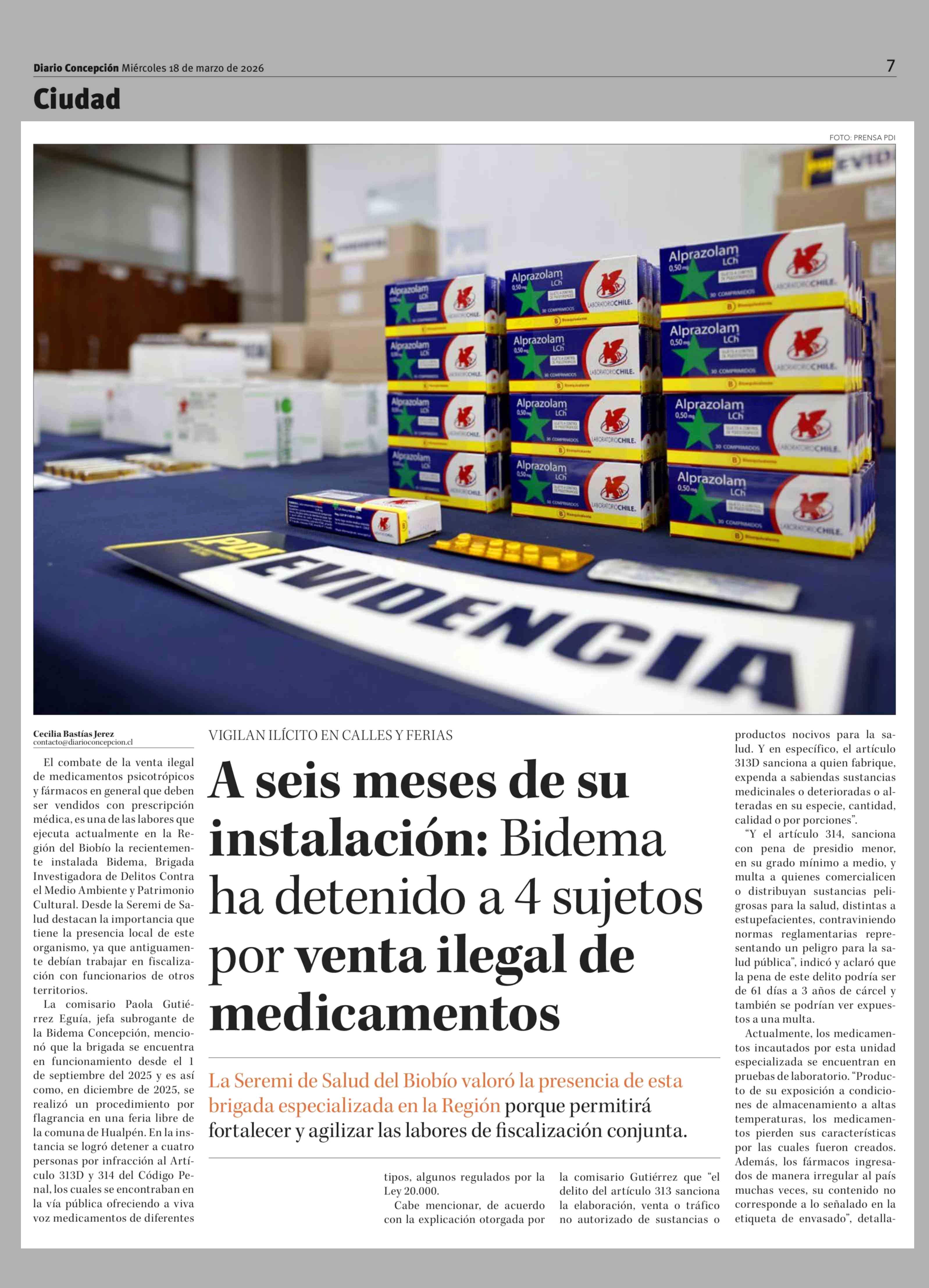 A seis meses de su instalación: Bidema ha detenido a 4 sujetos por venta ilegal de medicamentos 18-03-2026 Diario Concepción |