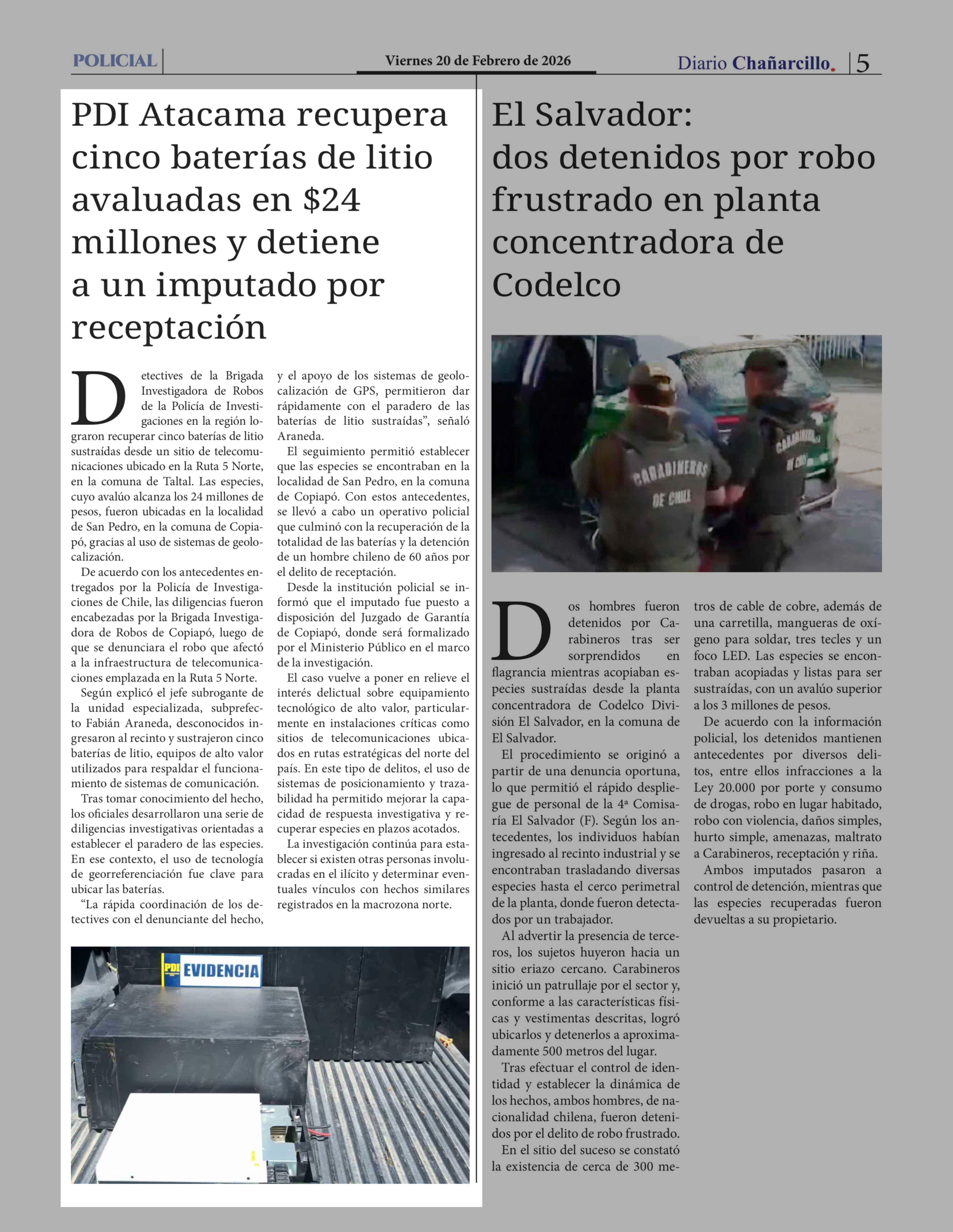 Título: PDI Atacama recupera cinco baterías de litio avaluadas en $24 millones y detiene a un imputado por receptación