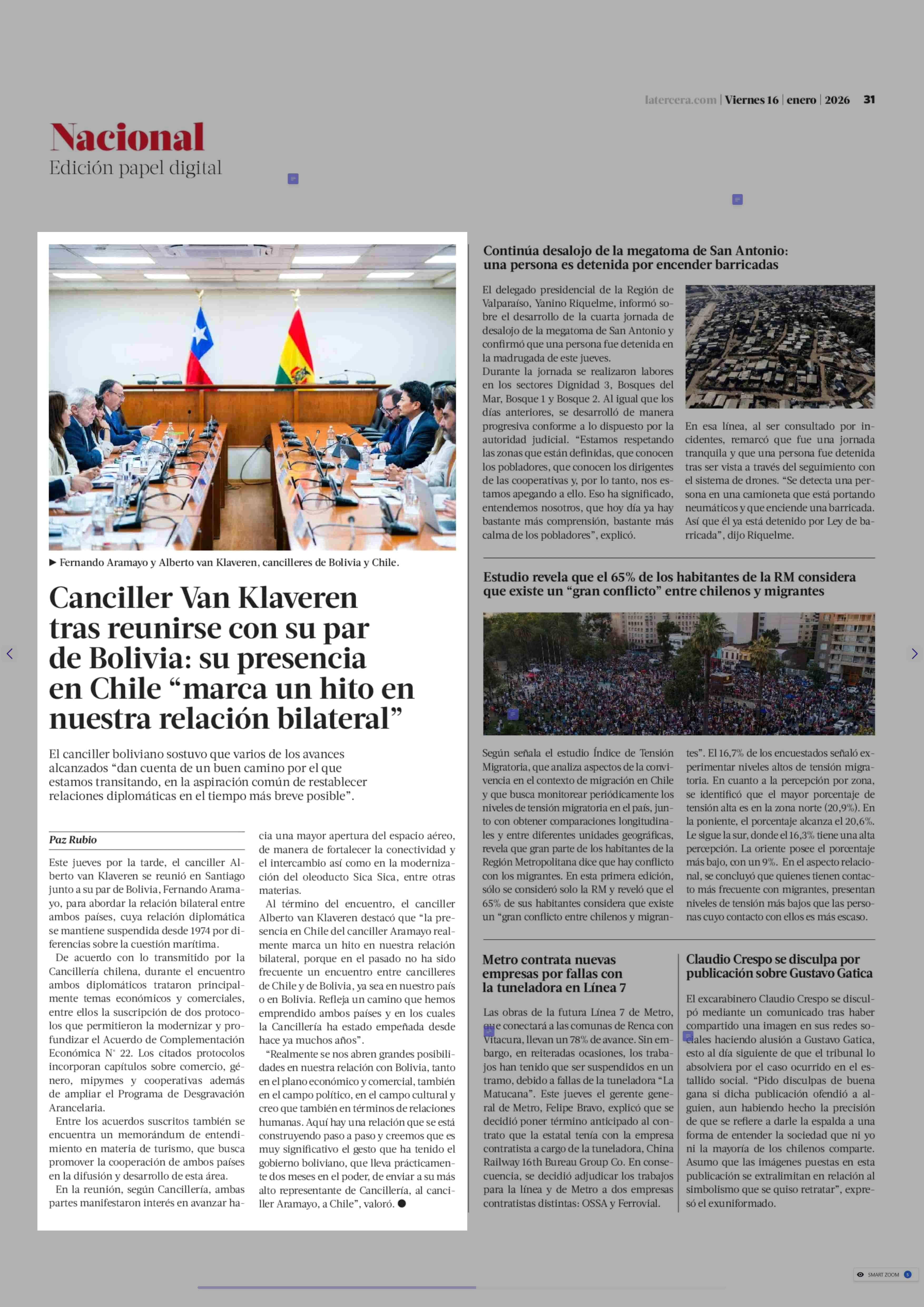 Canciller Van Klaveren tras reunirse con su par de Bolivia: su presencia en Chile "marca un hito en nuestra relación bilateral" 16-01-2026 La Tercera |