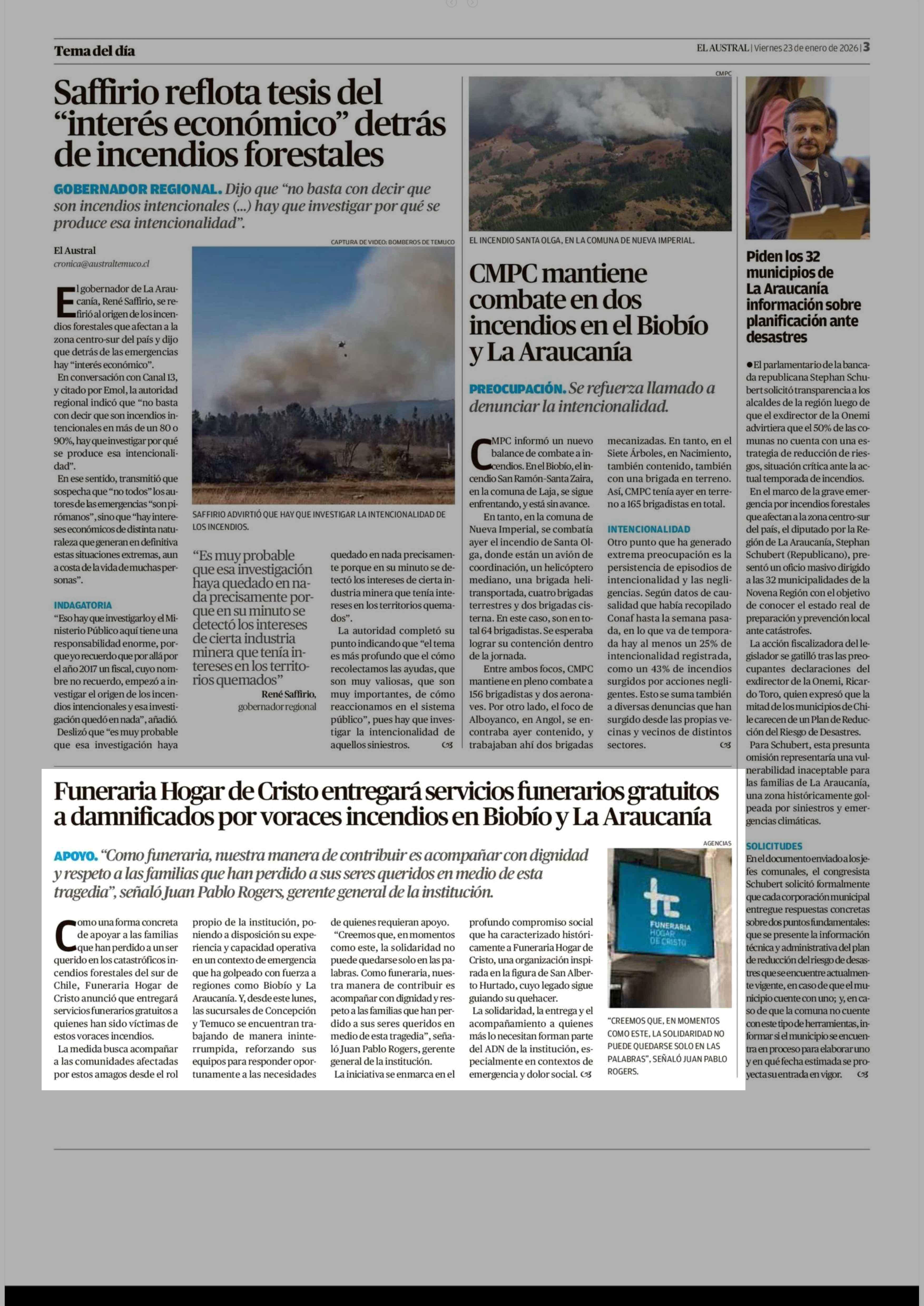 Funeraria Hogar de Cristo entregará servicios funerarios gratuitos a damnificados por voraces incendios en Biobio y La Araucanía 23-01-2026 El Austral de la Araucanía |