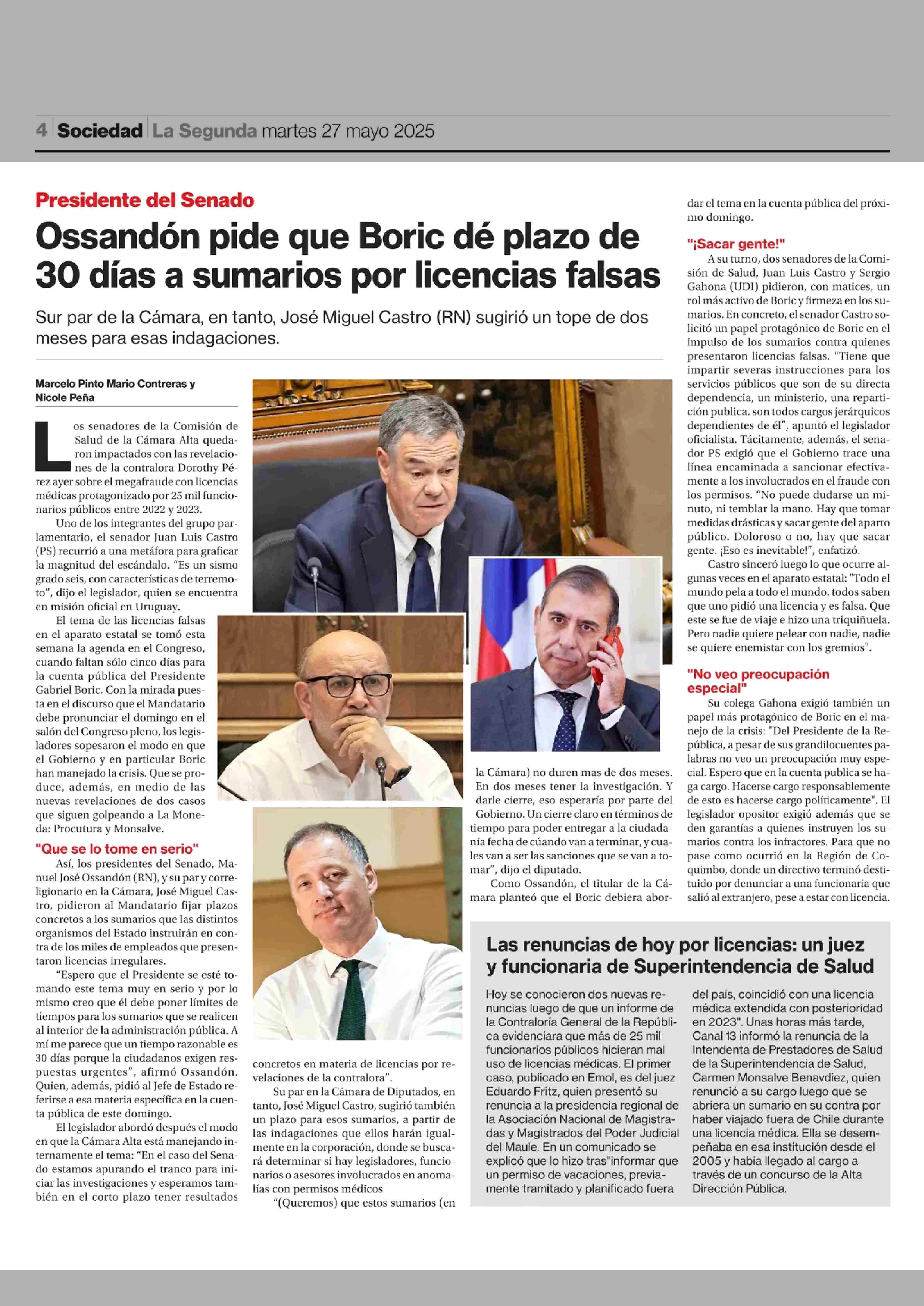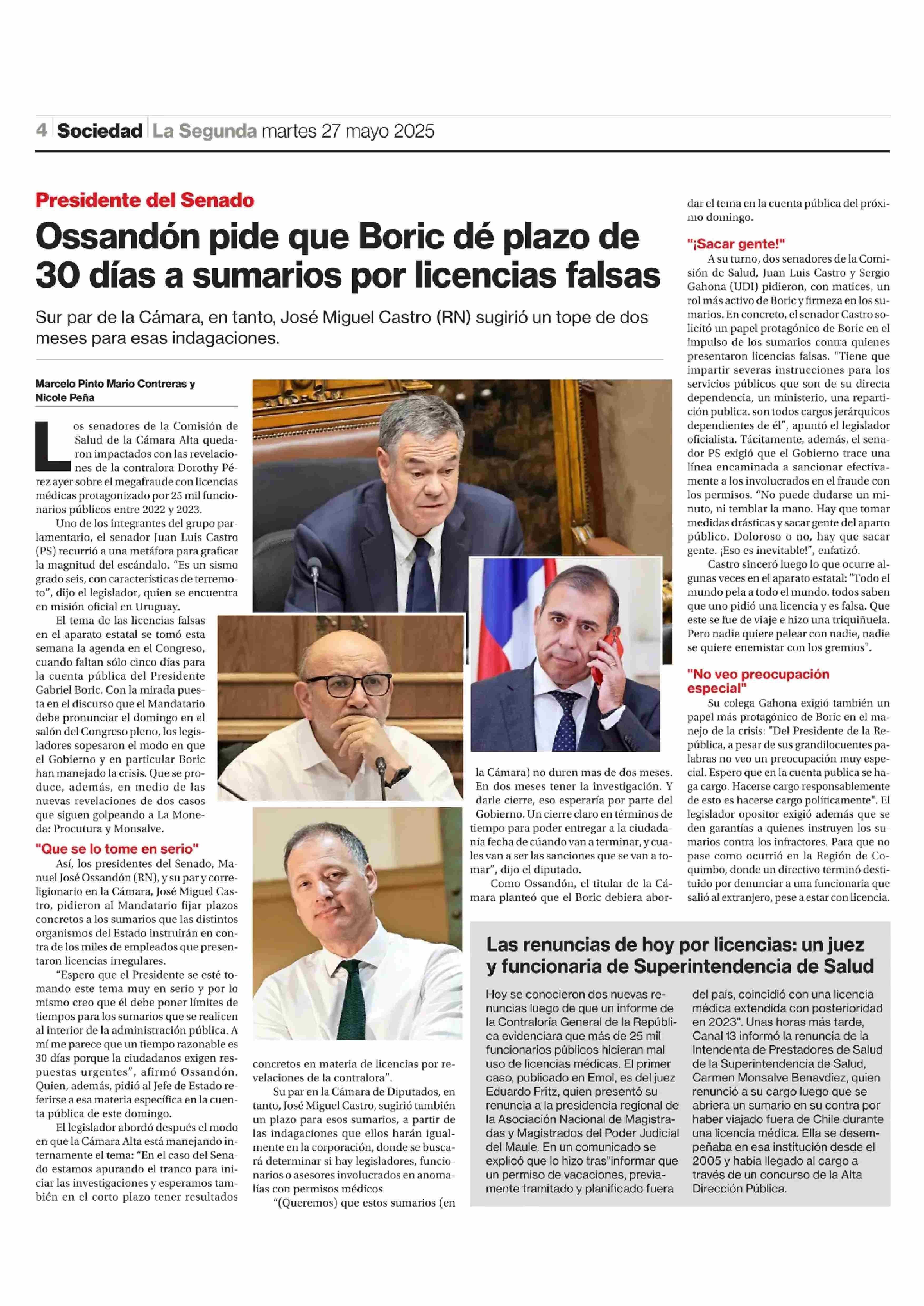 Ossandón pide que Boric dé plazo de 30 días a sumarios por licencias falsas 27-05-2025 La Segunda |