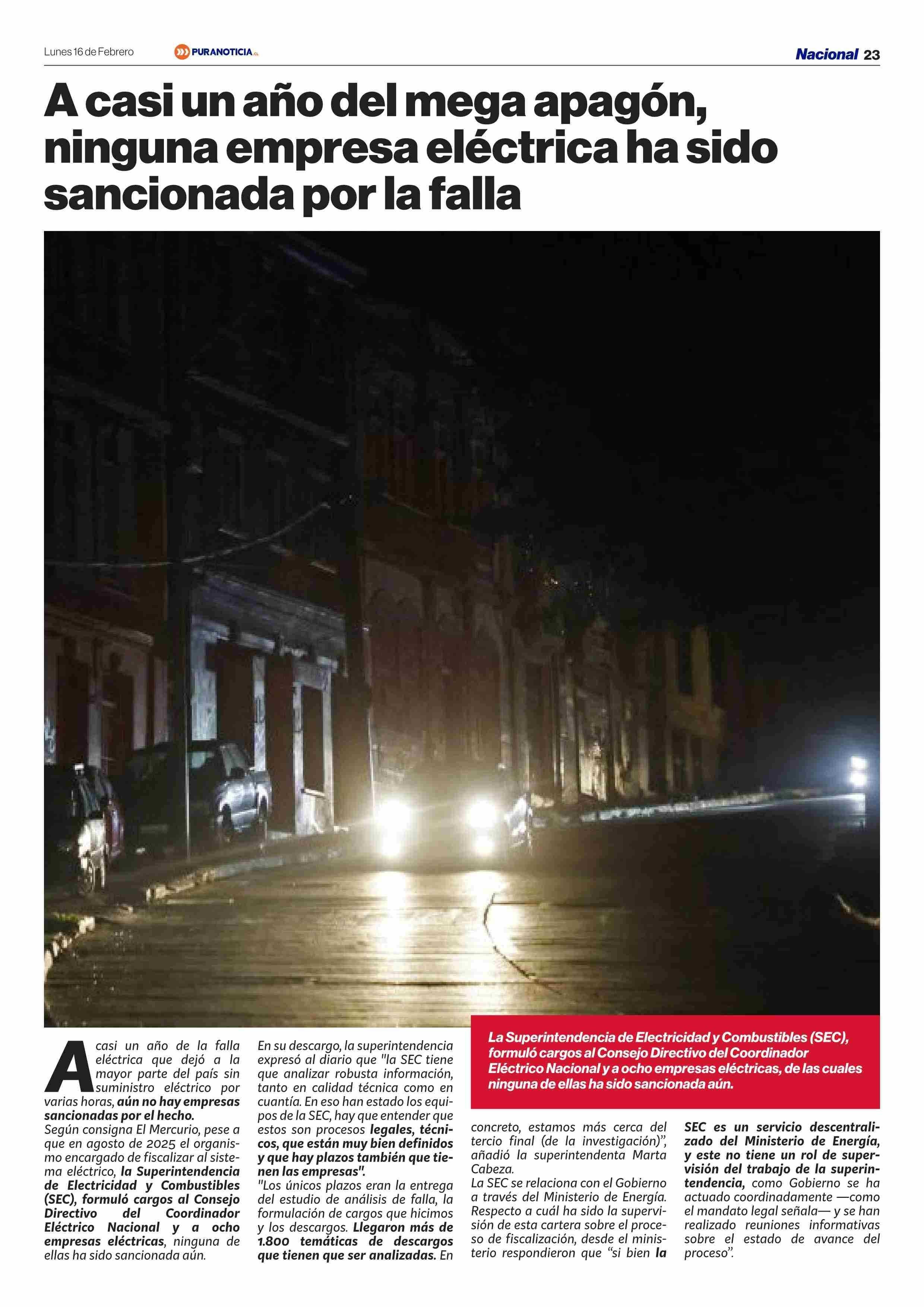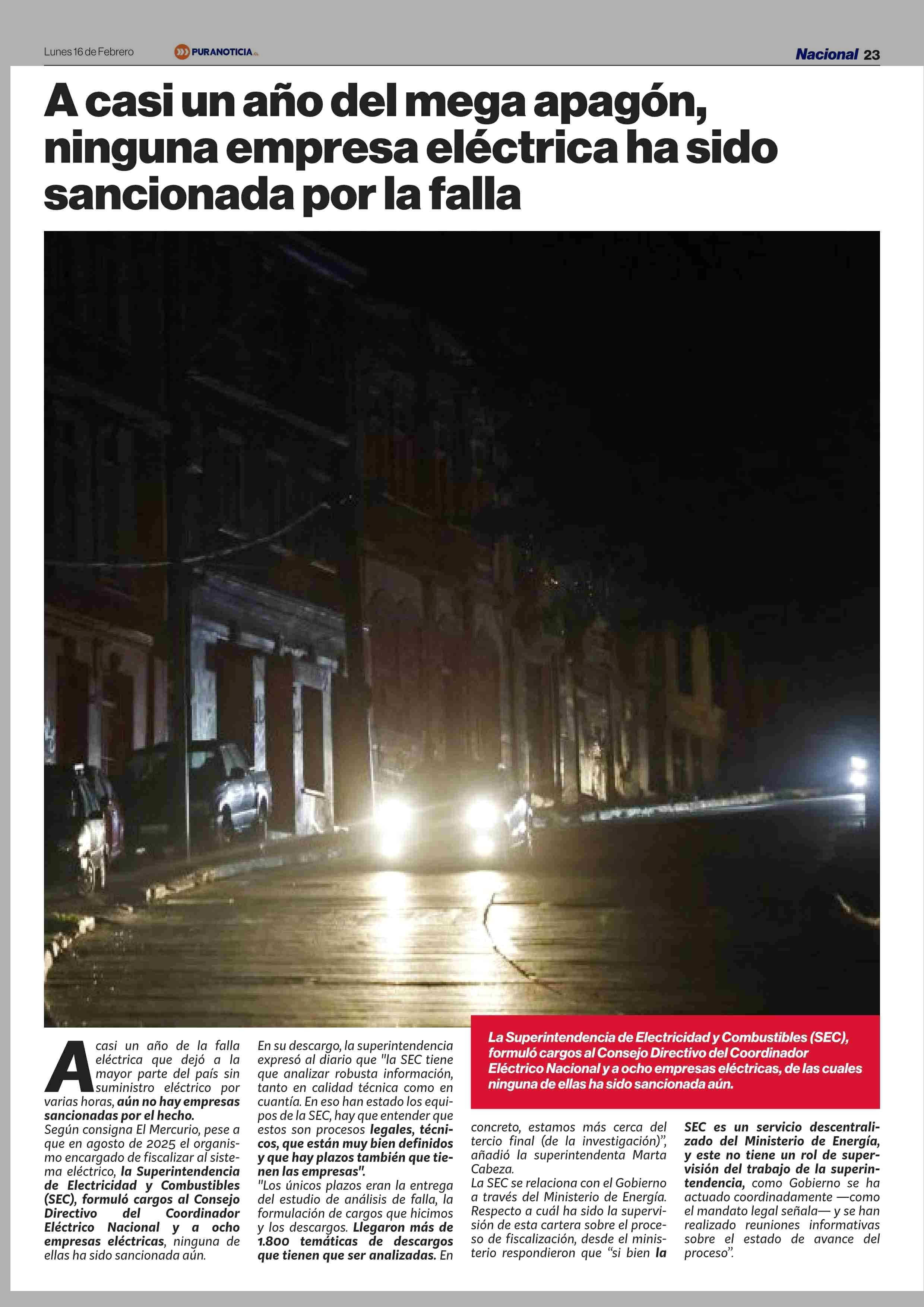 A casi un año del mega apagón, ninguna empresa eléctrica ha sido sancionada por la falla 16-02-2026 Puranoticia.cl |