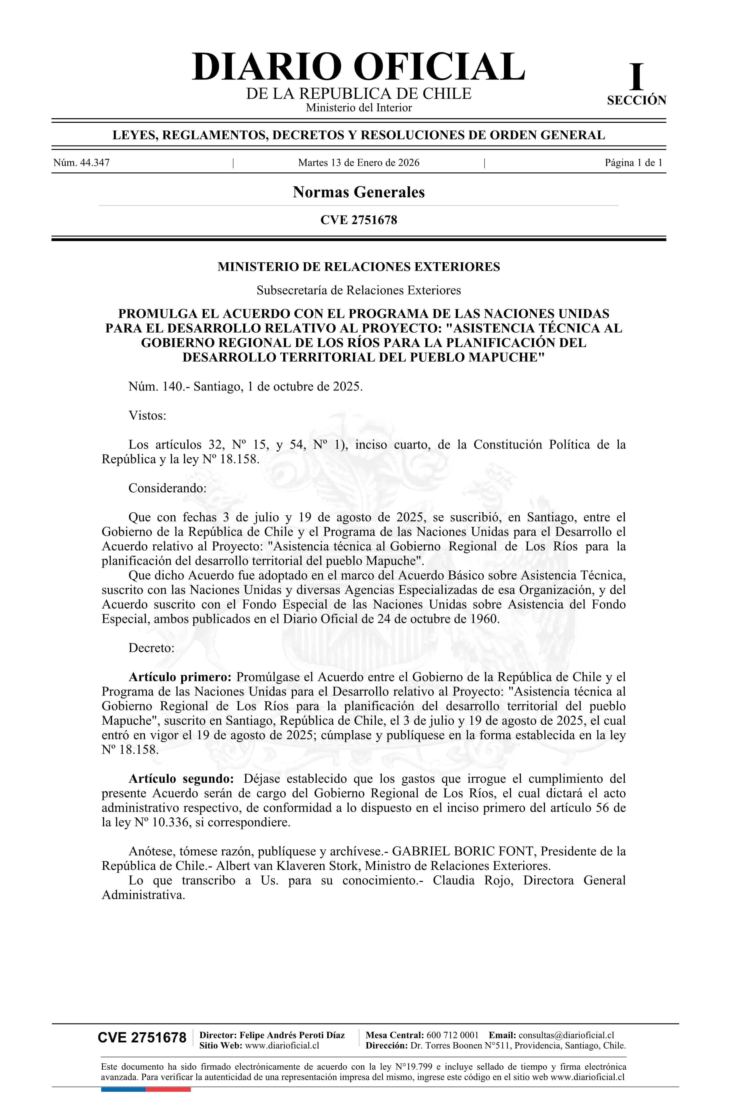 Título: Decreto número 140, de 2025.- Promulga el Acuerdo con el Programa de las Naciones Unidas para el Desarrollo relativo al proyecto: Asistencia Técnica al Gobierno Regional de Los Ríos para la Planificación del Desarrollo Territorial del Pueblo Mapuche