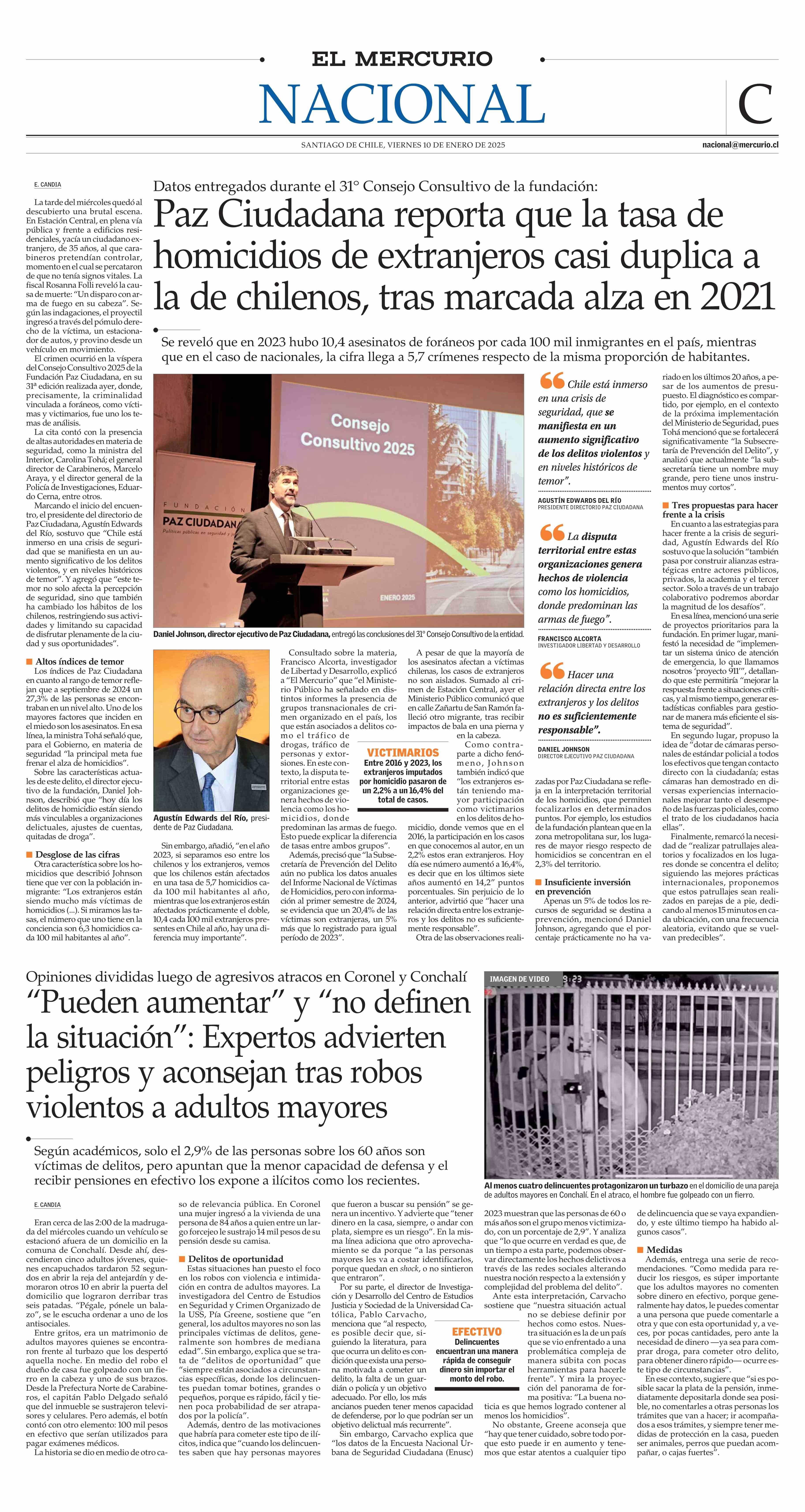 Paz Ciudadana reporta que la tasa de homicidios de extranjeros casi duplica a la de chilenos, tras marcada alza en 2021 10-01-2025 El Mercurio |