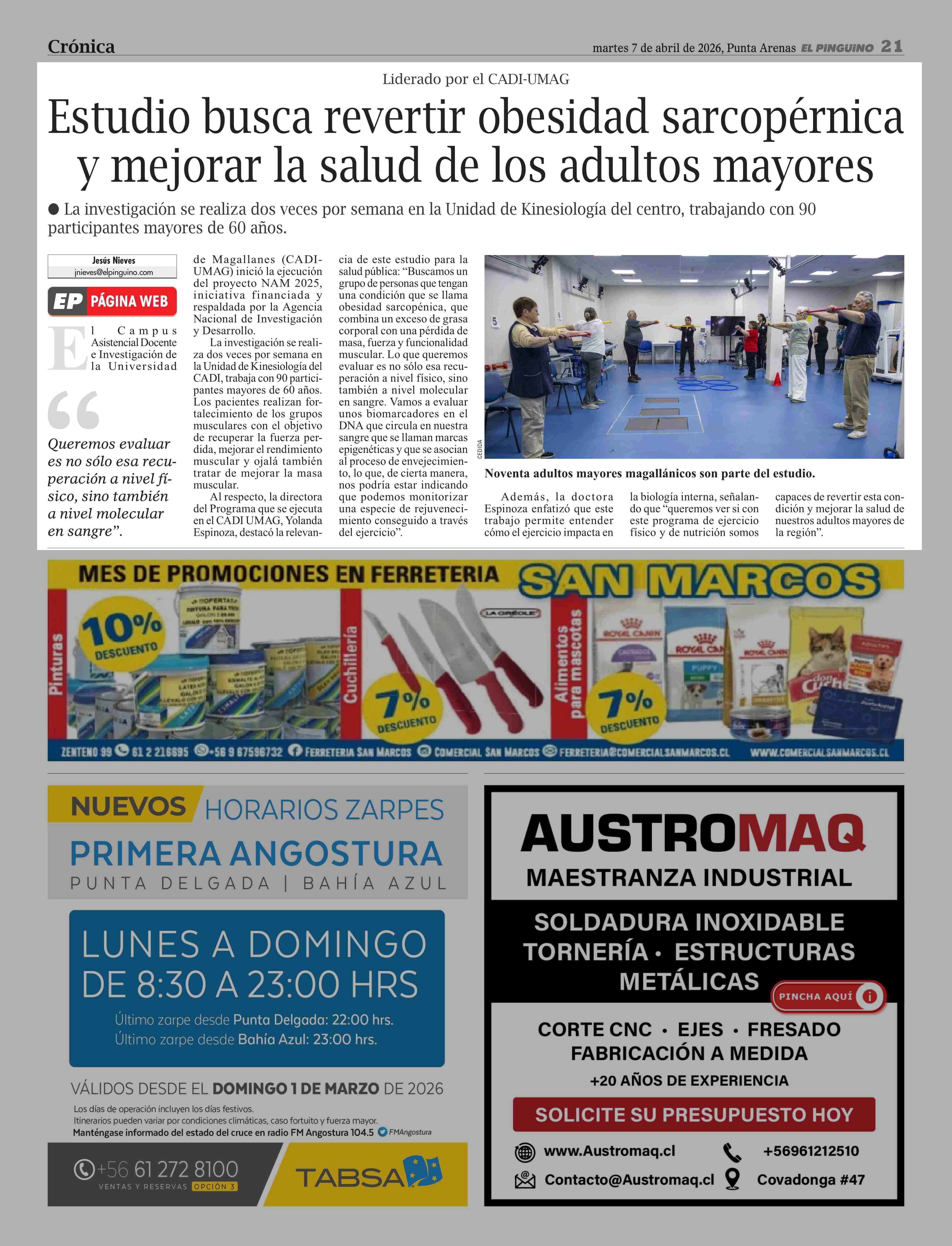 Estudio busca revertir obesidad sarcopérnica y mejorar la salud de los adultos mayores 07-04-2026 El Pingüino |