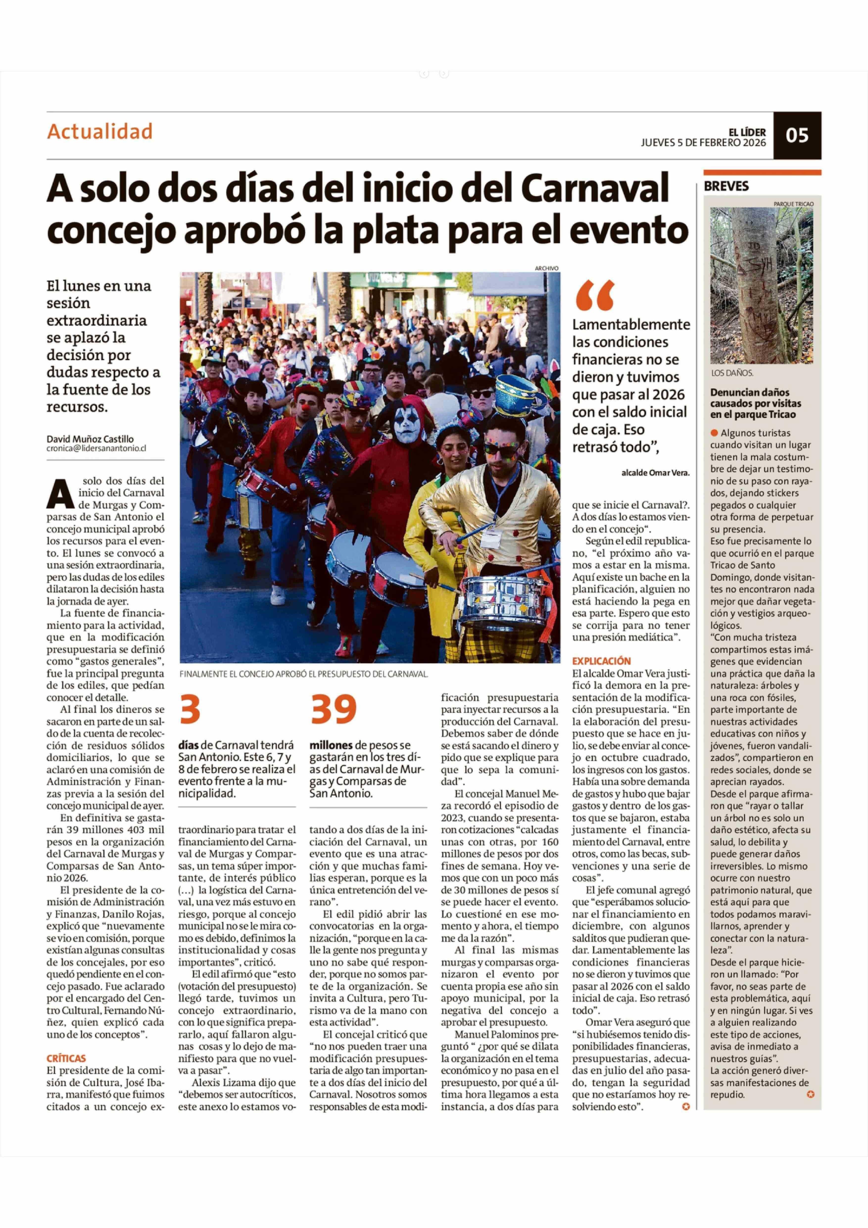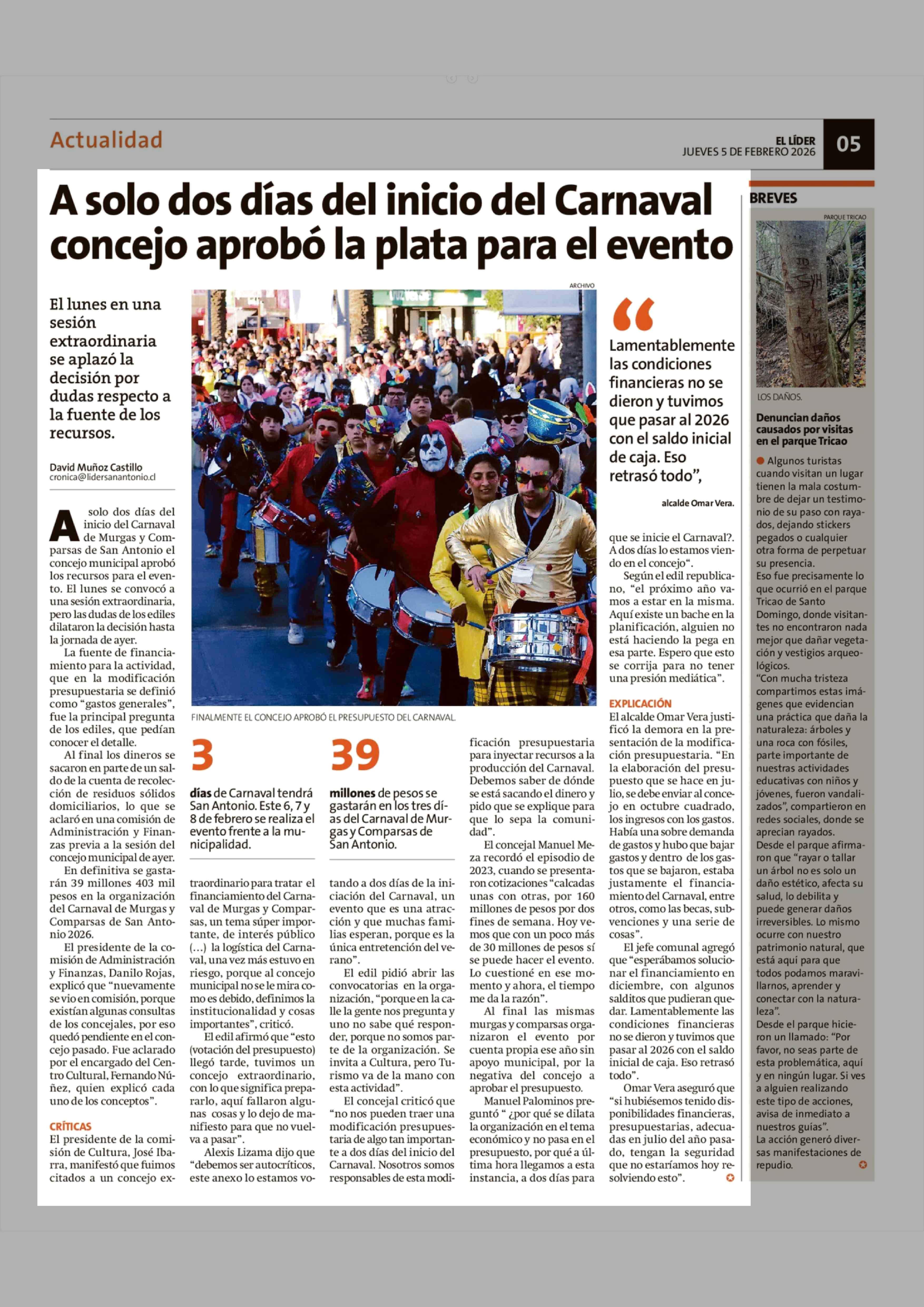 A solo dos días del inicio del Carnaval concejo aprobó la plata para el evento 05-02-2026 El Líder |