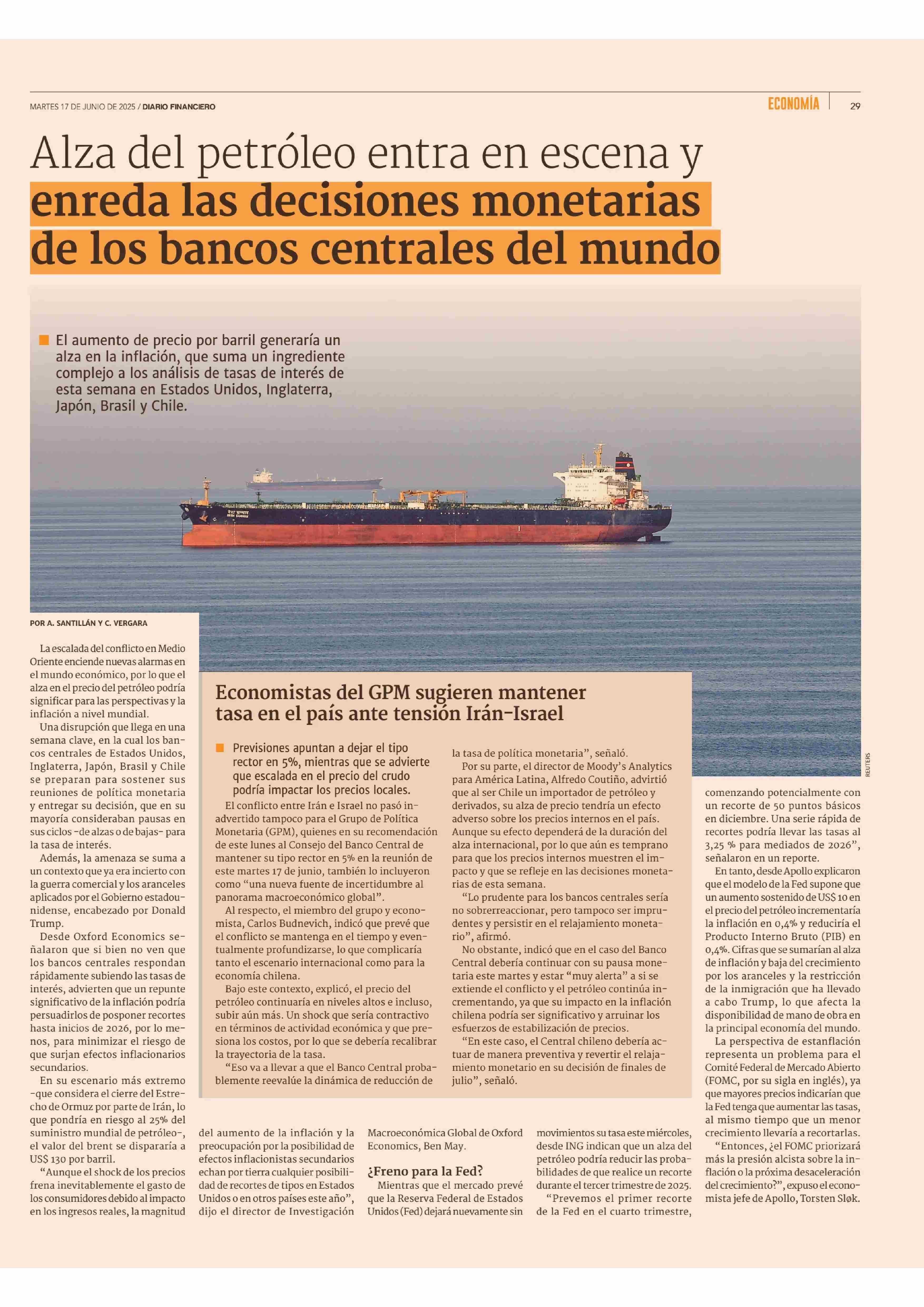 Alza del petróleo entra en escena y enreda las decisiones monetarias de los bancos centrales del mundo 17-06-2025 Diario Financiero |
