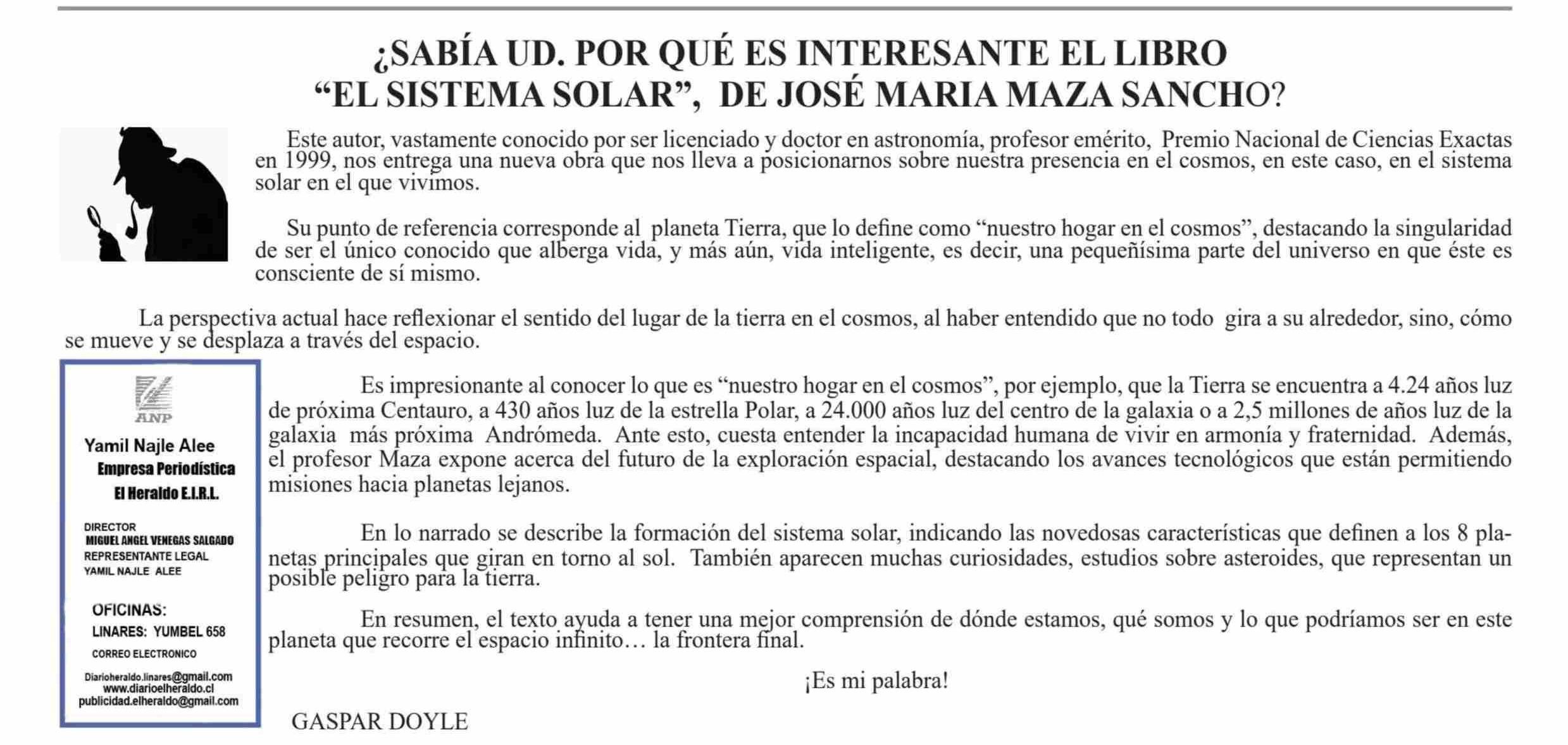 ¿SABÍA UD. POR QUÉ ES INTERESANTE EL LIBRO “EL SISTEMA SOLAR”. DE JOSE MARIA MAZA SANCHO? 03-05-2025 El Heraldo |