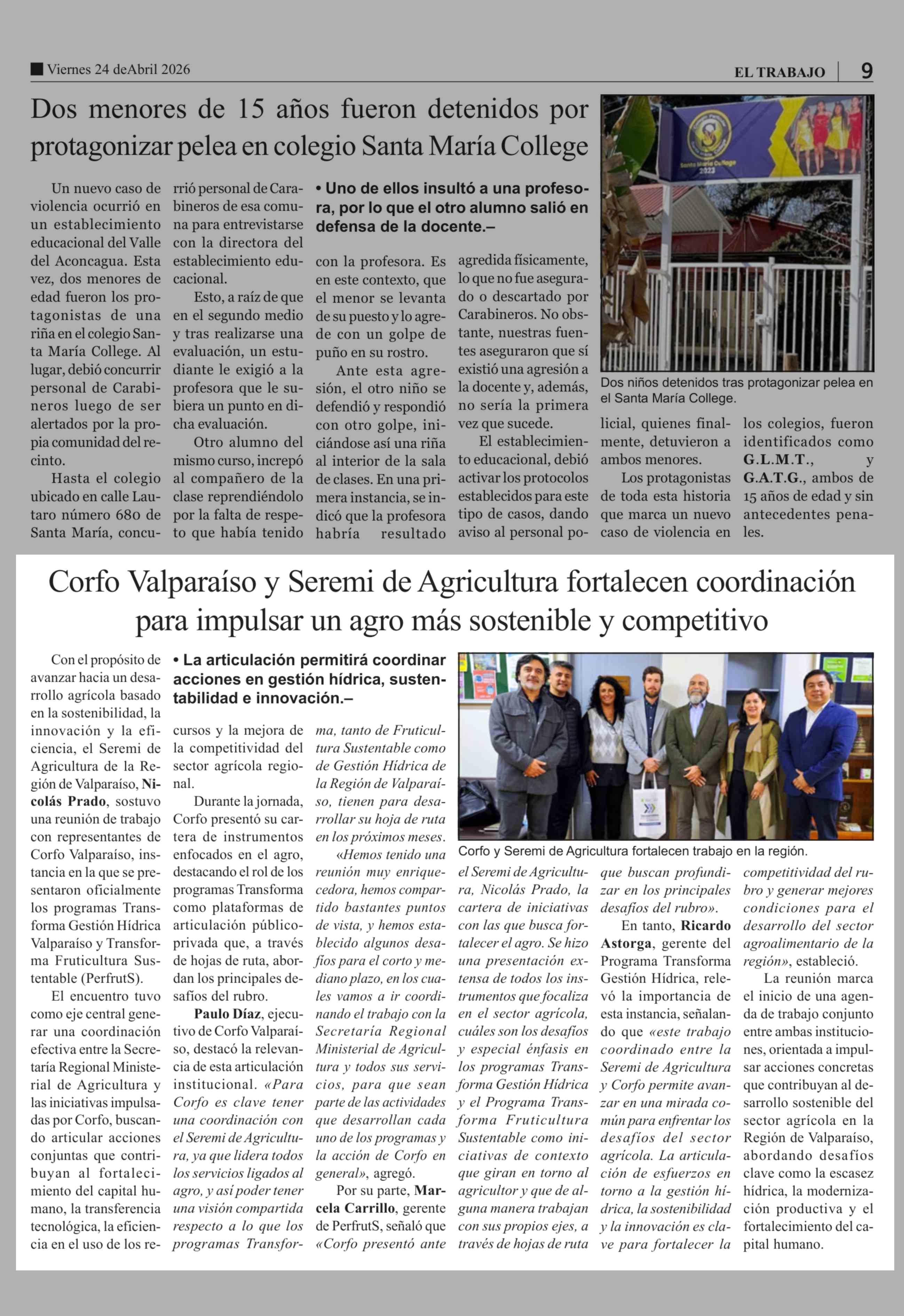 Corfo Valparaíso y Seremi de Agricultura fortalecen coordinación para impulsar un agro más sostenible y competitivo 24-04-2026 El Trabajo |