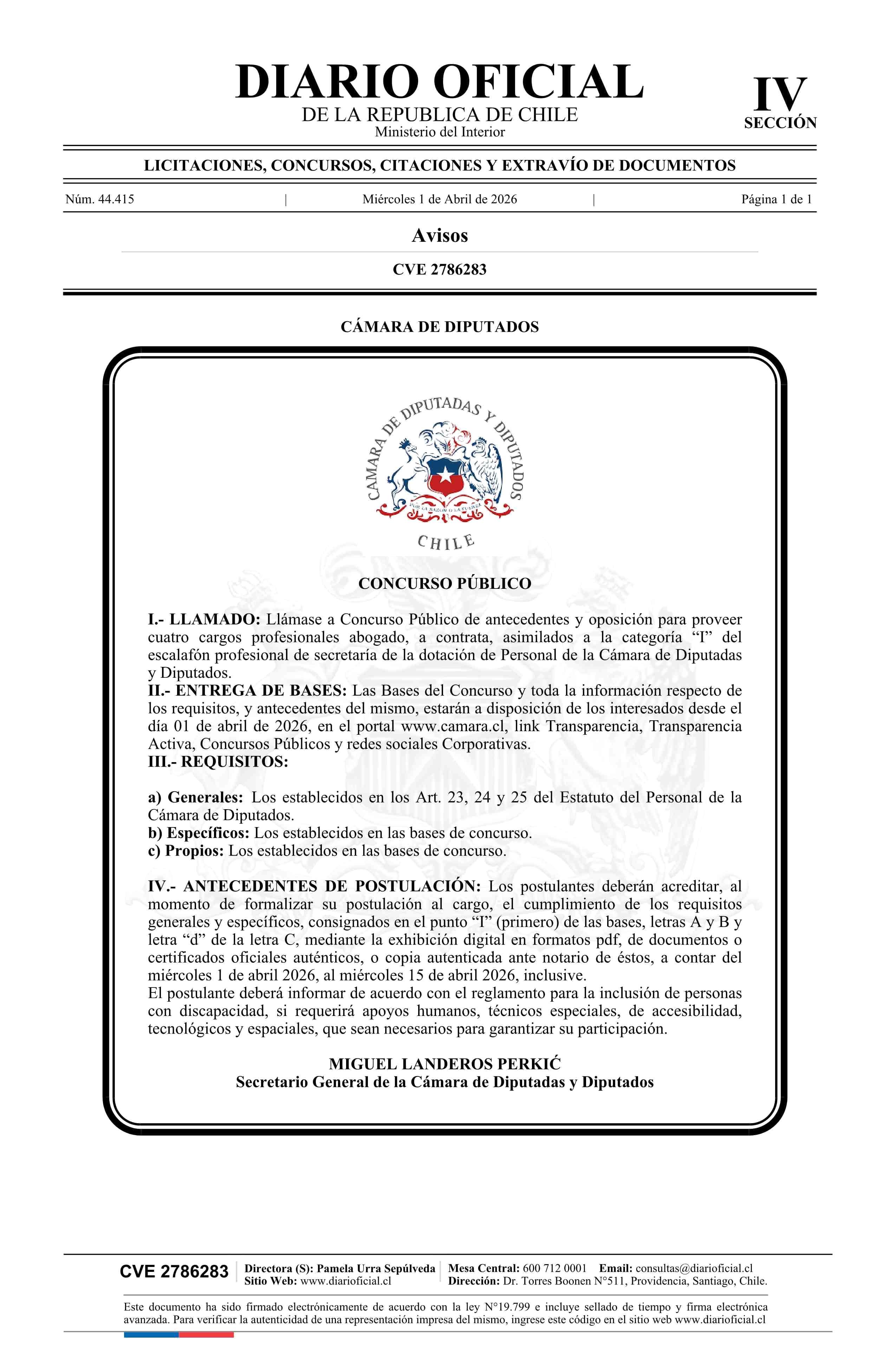AVISO LICITACIONES: Llama a concurso público para proveer cargos profesionales de Abogado 01-04-2026 Diario Oficial Edición Electrónica |