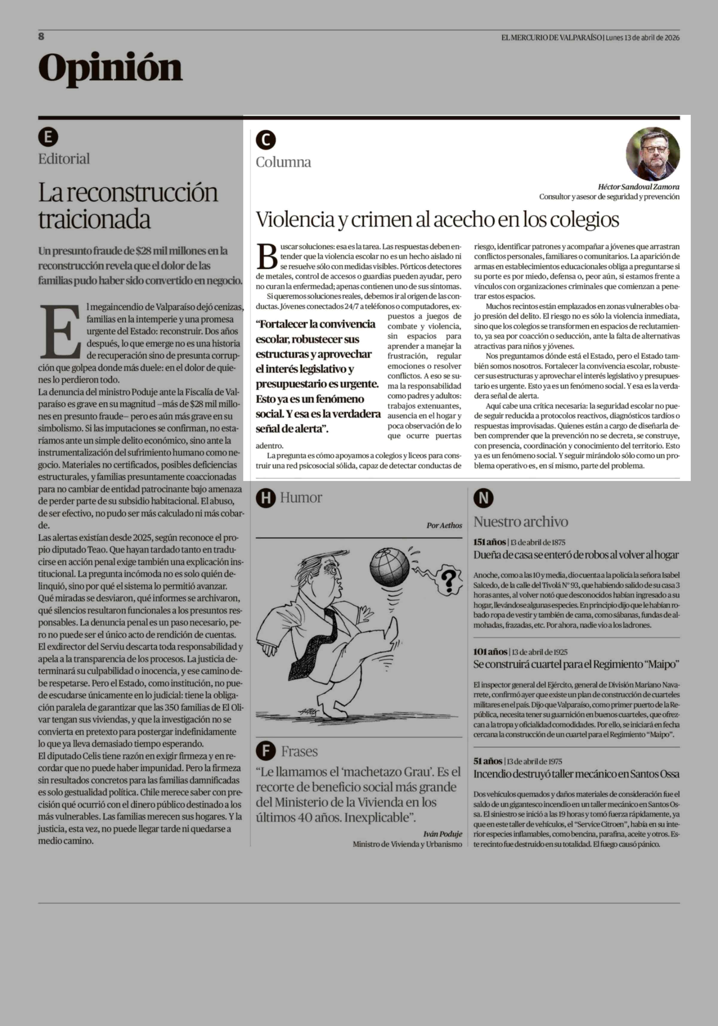 Columnas de Opinión: Violencia y crimen al acecho en los colegios 13-04-2026 El Mercurio de Valparaíso |