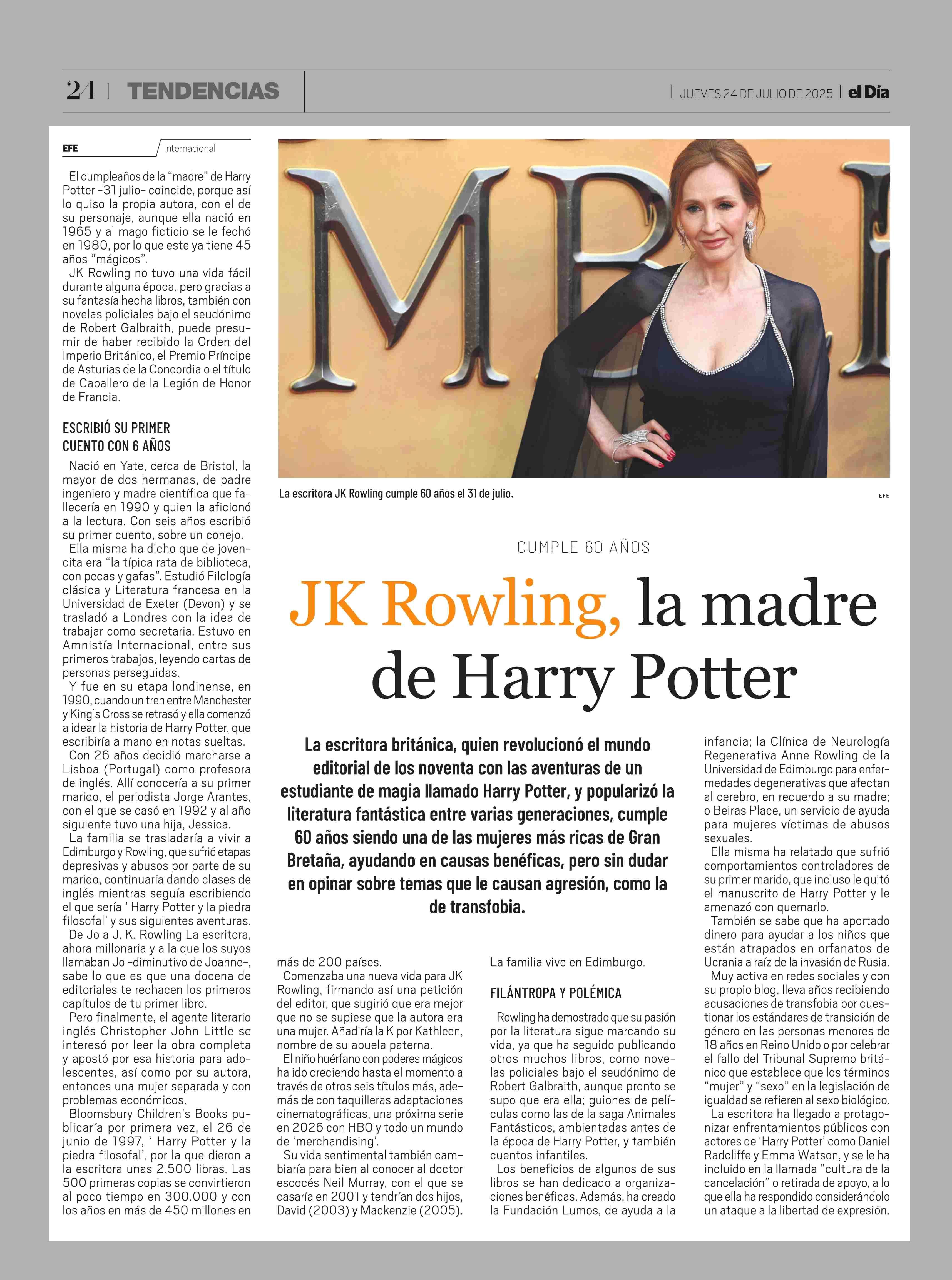 JK Rowling, la madre de Harry Potter 24-07-2025 El Día |