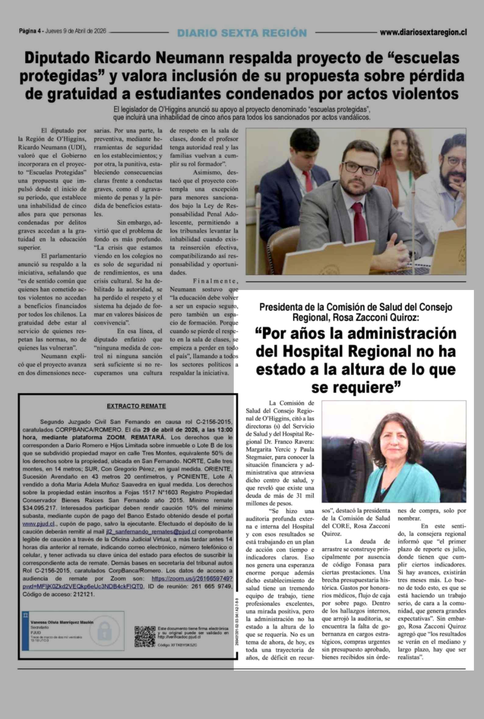 "Por años la administración del Hospital Regional no ha estado a la altura de lo que se requiere" 09-04-2026 Diario VI Región |