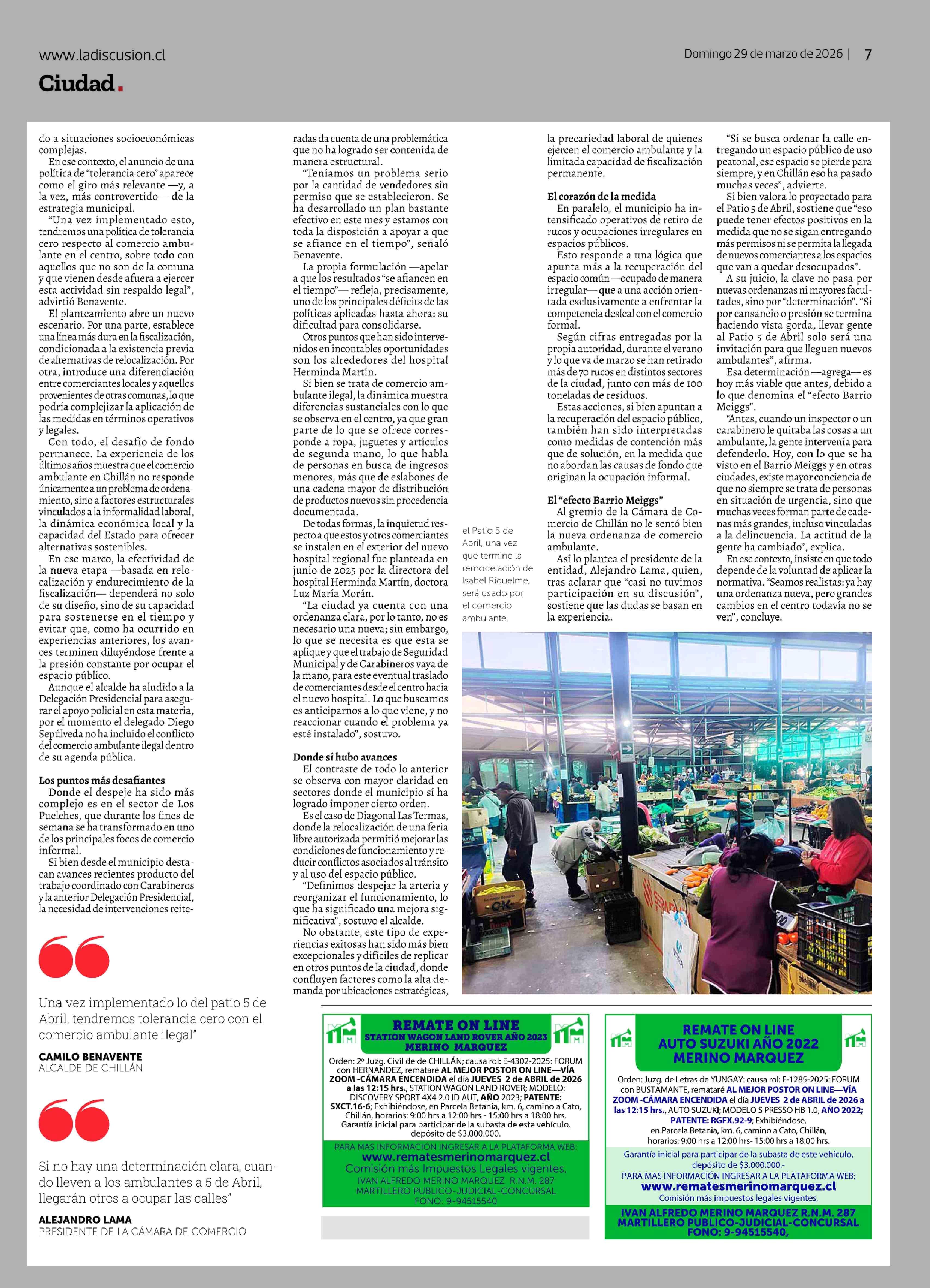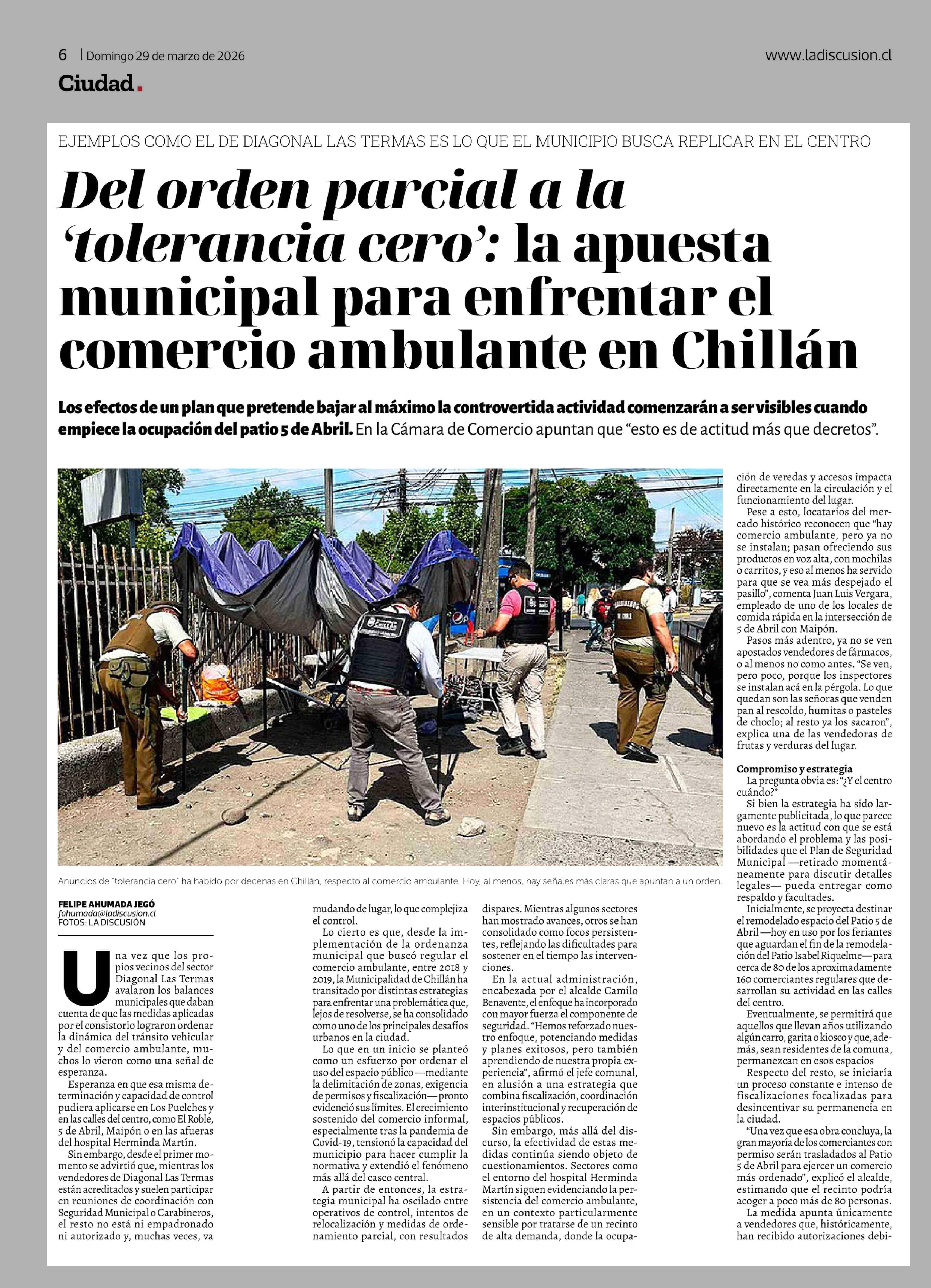 Del orden parcial a la 'tolerancia cero': la apuesta municipal para enfrentar el comercio ambulante en Chillán 29-03-2026 La Discusión |