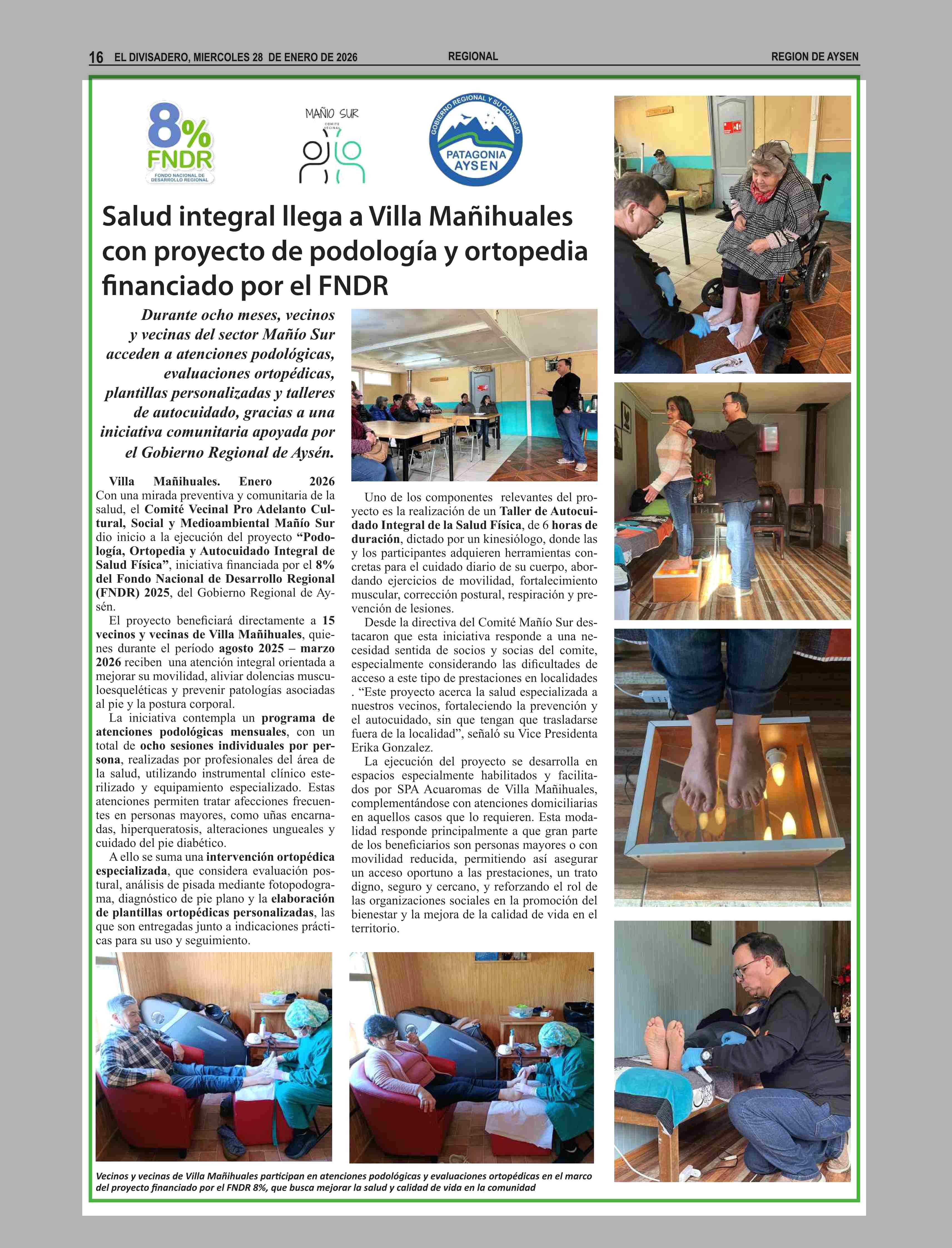 | Título: | Salud integral llega a Villa Mañihuales con proyecto de podología y ortopedia financiado por el FNDR |