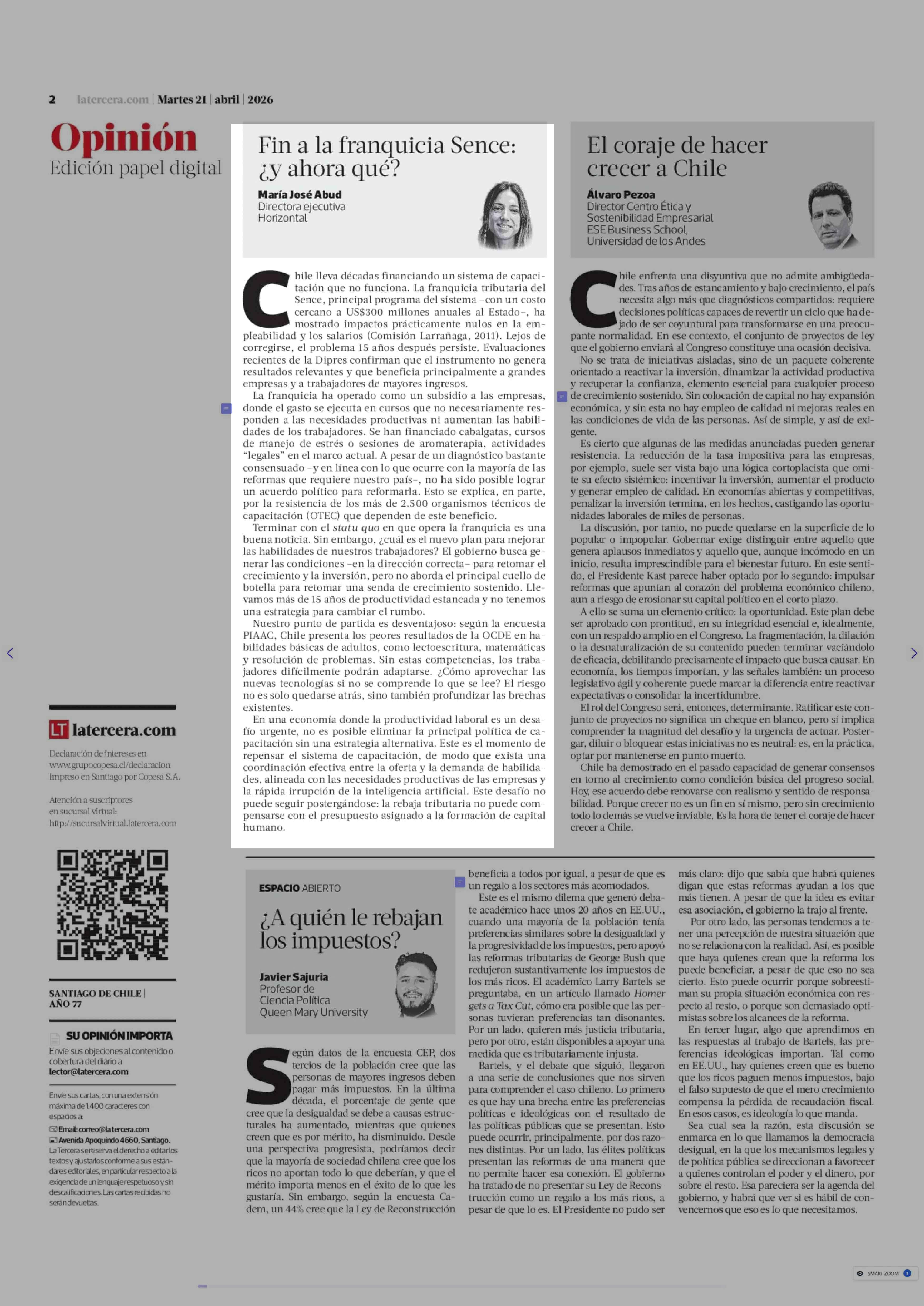 Columnas de Opinión: Fin a la franquicia Sence: ¿y ahora qué? 21-04-2026 La Tercera |