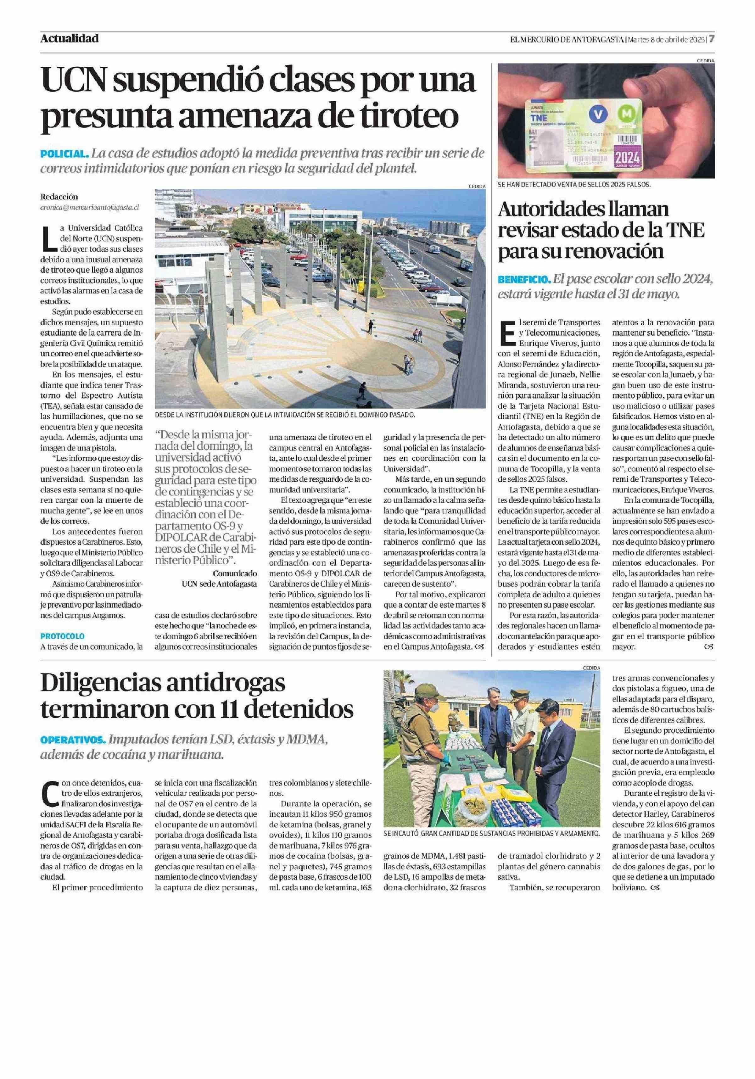 UCN suspendió clases por una presunta amenaza de tiroteo 08-04-2025 El Mercurio de Antofagasta |