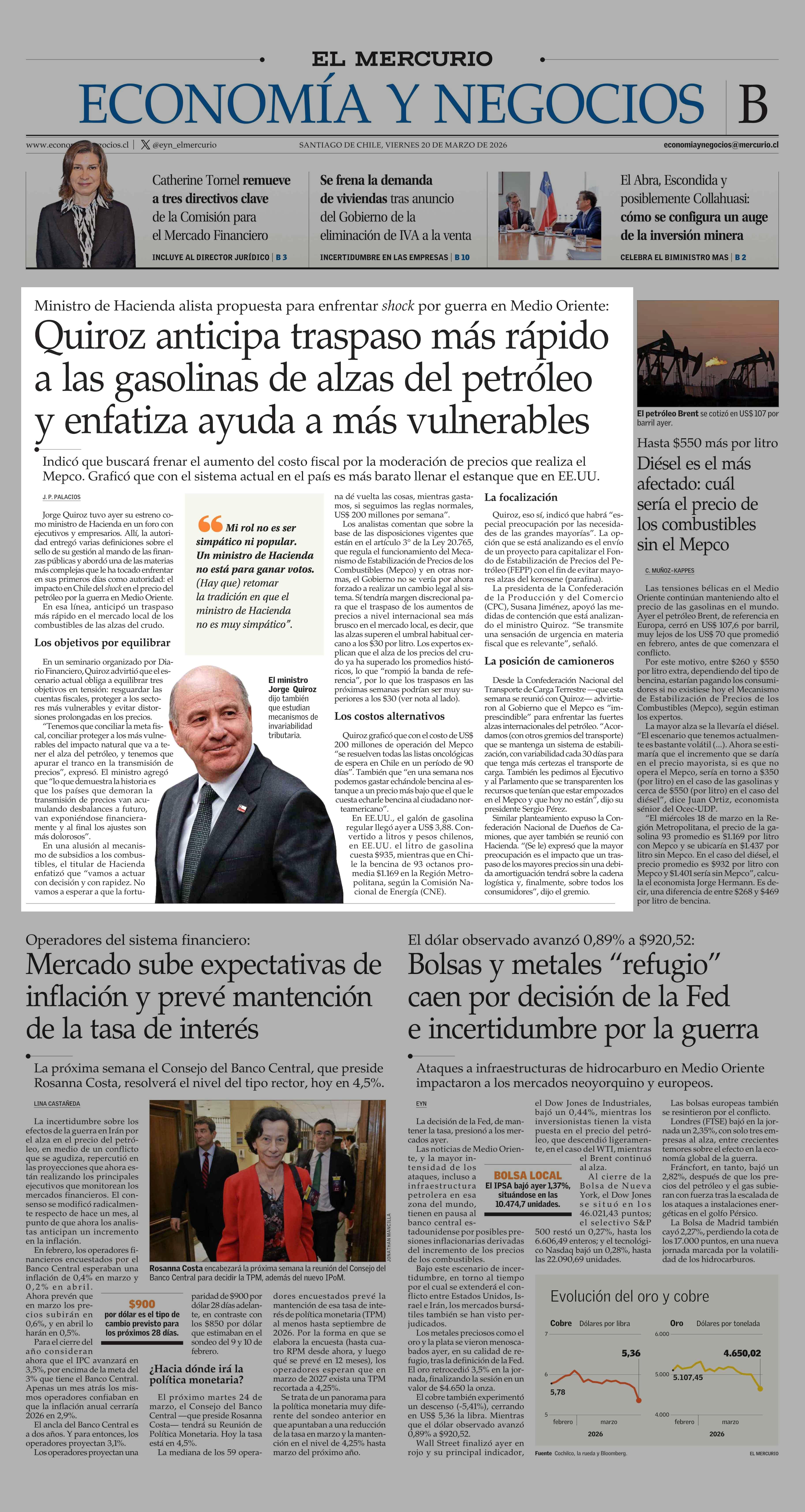 Quiroz anticipa traspaso más rápido a las gasolinas de alzas del petróleo y enfatiza ayuda a más vulnerables 20-03-2026 El Mercurio |