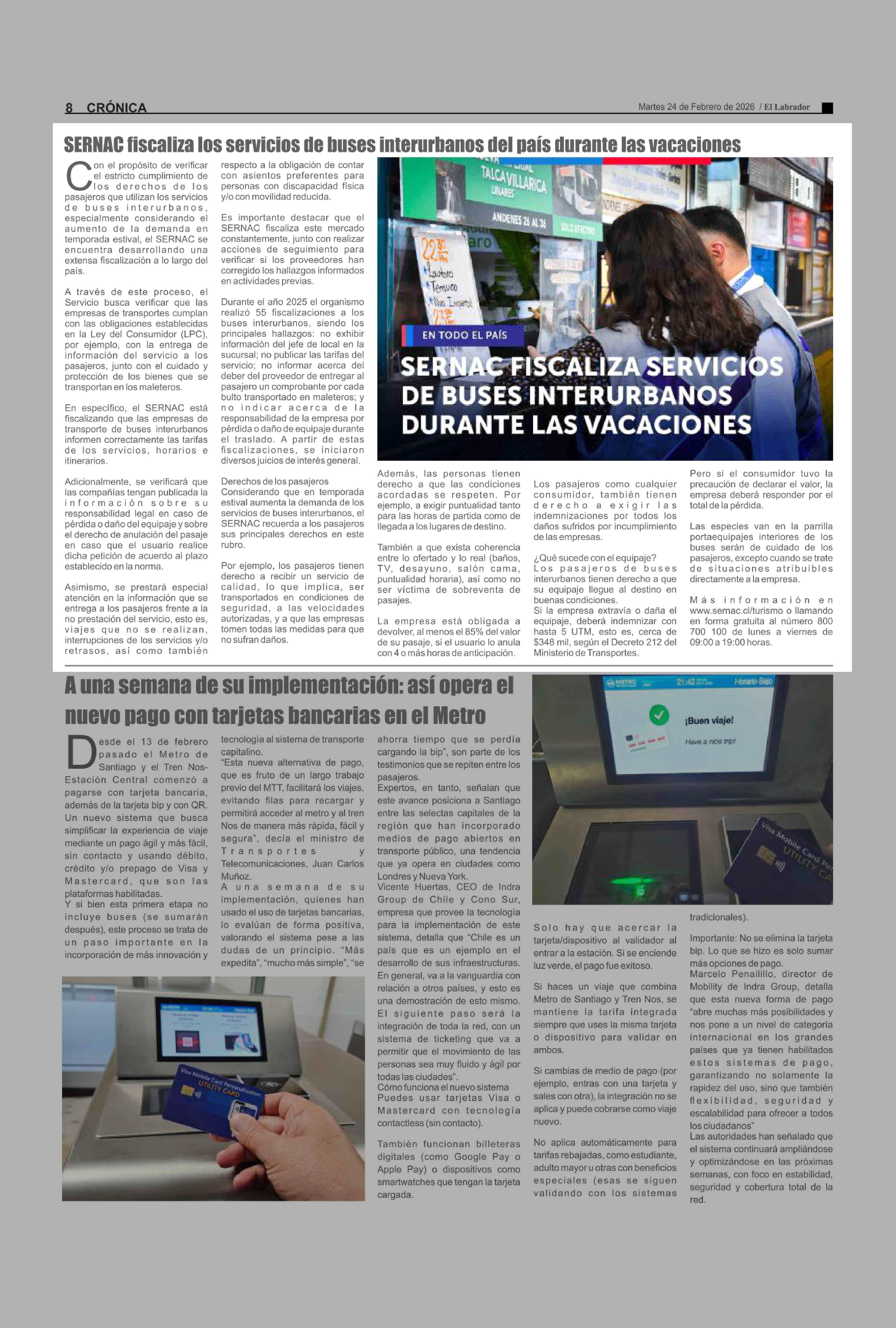 SERNAC FISCALIZA SERVICIOS DE BUSES INTERURBANOS DURANTE LAS VACACIONES 24-02-2026 El Labrador |
