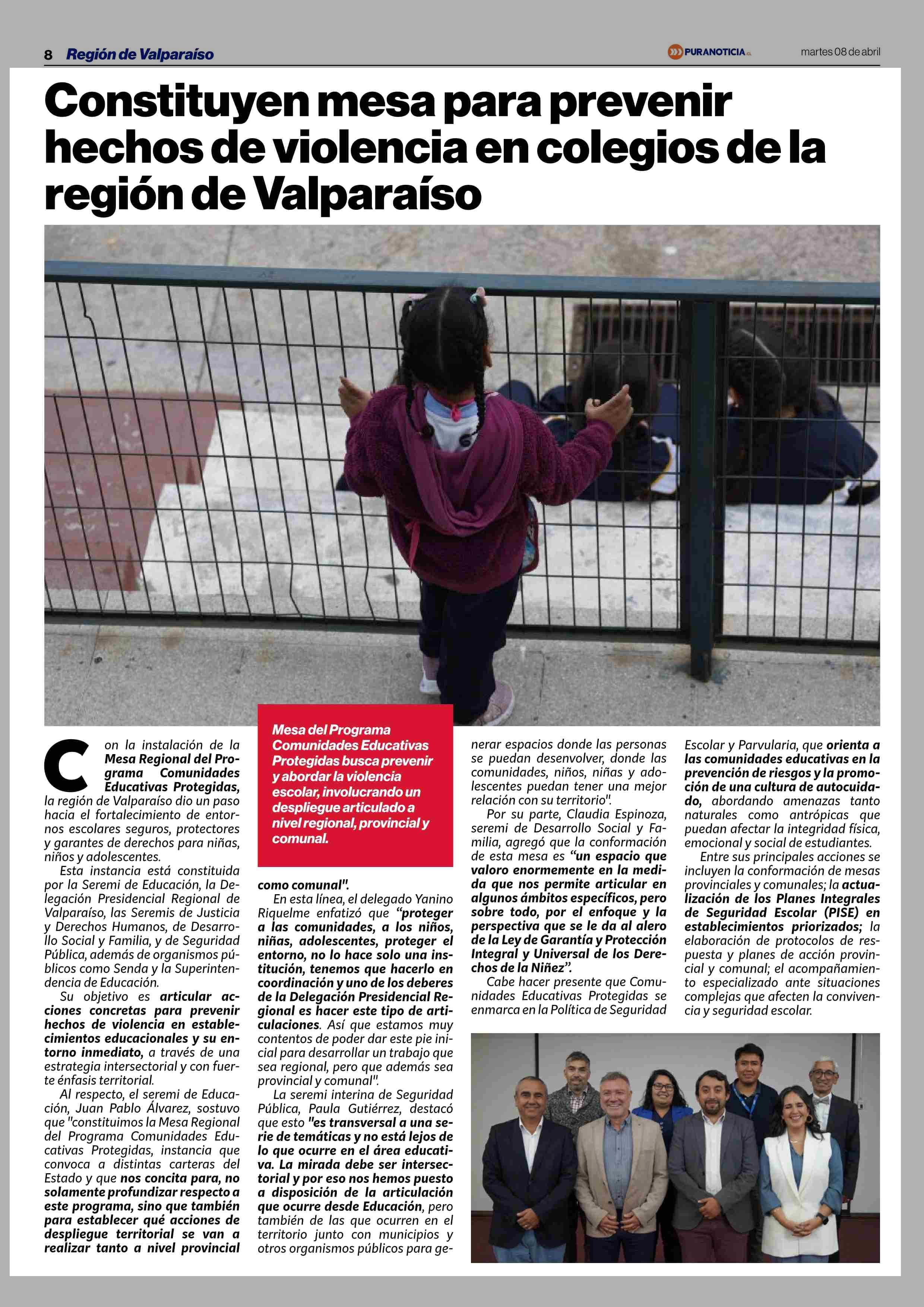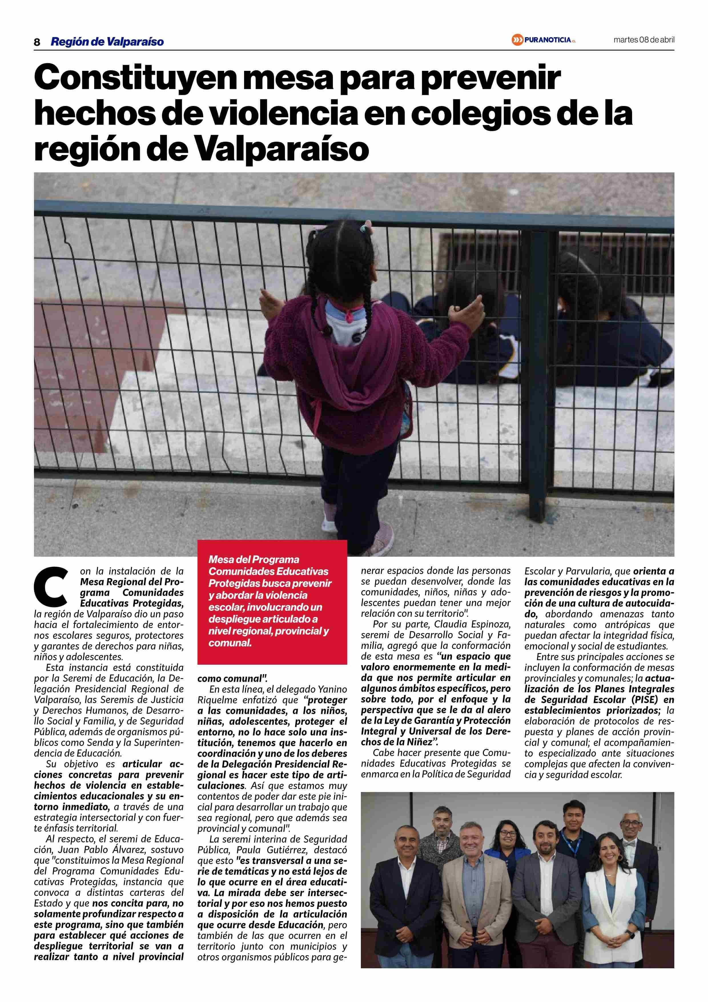 Constituyen mesa para prevenir hechos de violencia en colegios de la región de Valparaíso 08-04-2025 Puranoticia.cl |
