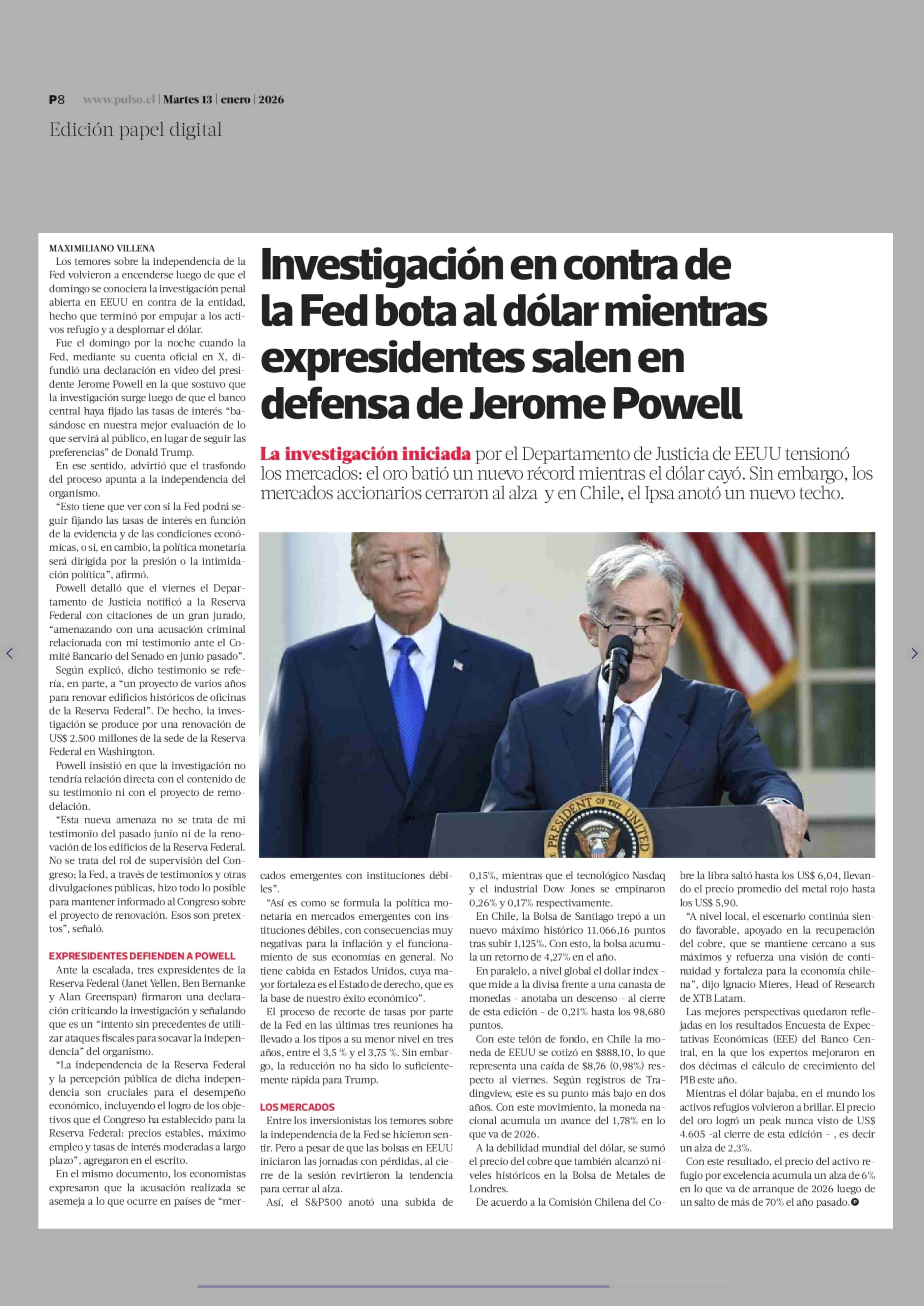 Investigación en contra de la Fed bota al dólar mientras expresidentes salen en defensa de Jerome Powell 13-01-2026 La Tercera |