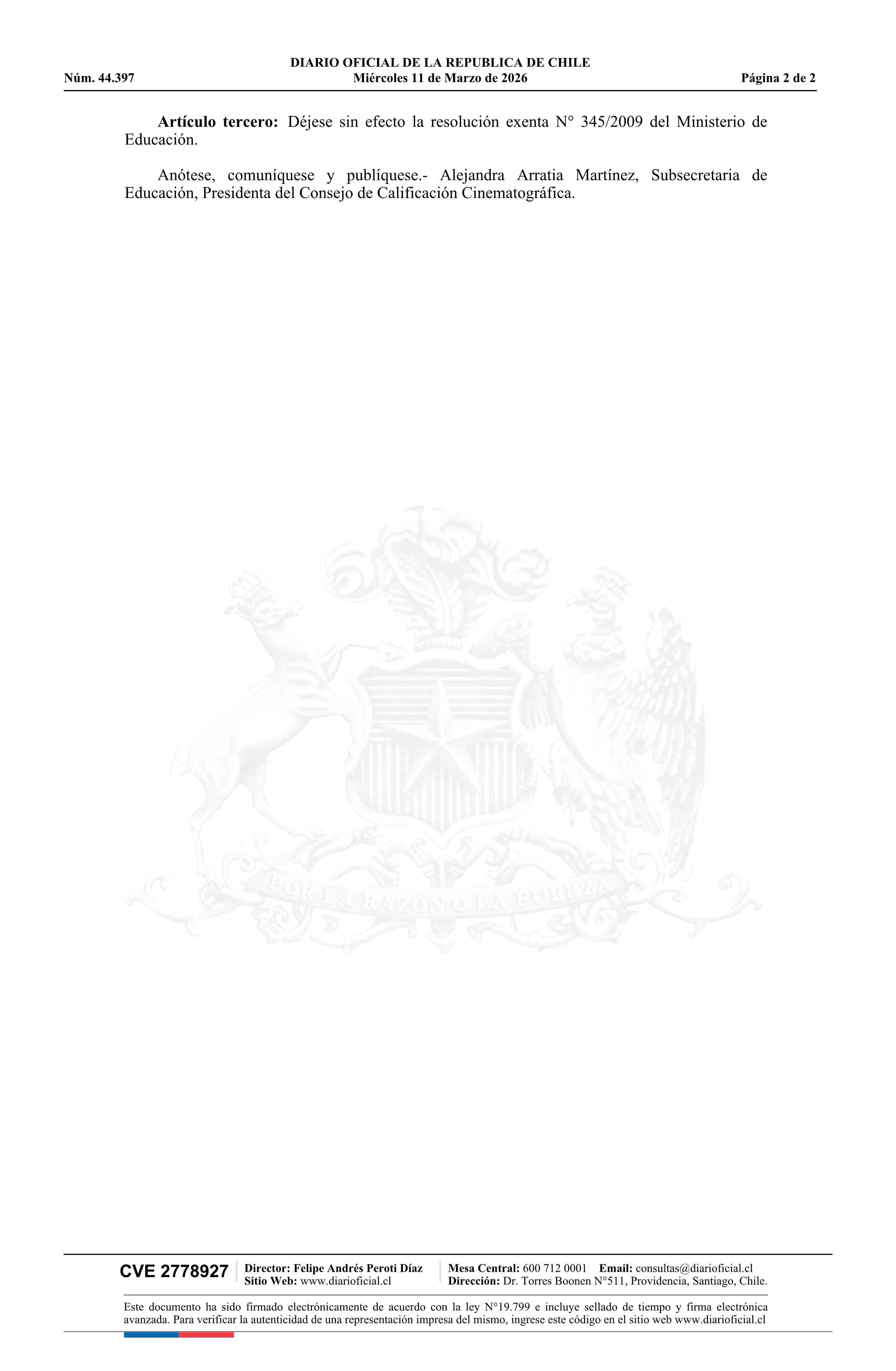 Título: Resolución exenta número 1.052, de 2026.- Acepta renuncia voluntaria que indica y designa nueva integrante del Consejo de Calificación Cinematográfica como representante de la Subsecretaría de Educación