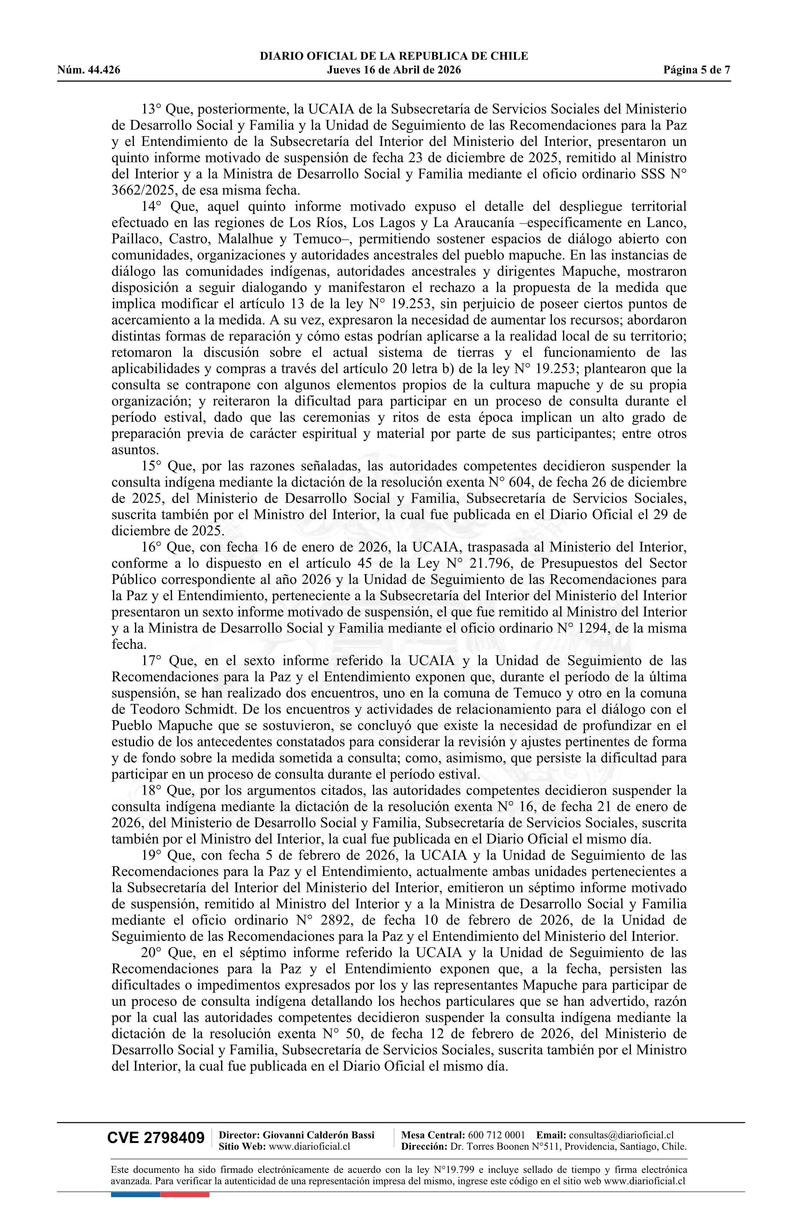 Título: Resolución exenta número 147, de 2026.- Suspende proceso de consulta indígena instruido mediante resolución N° 244 exenta, de 2025, por motivos que indica