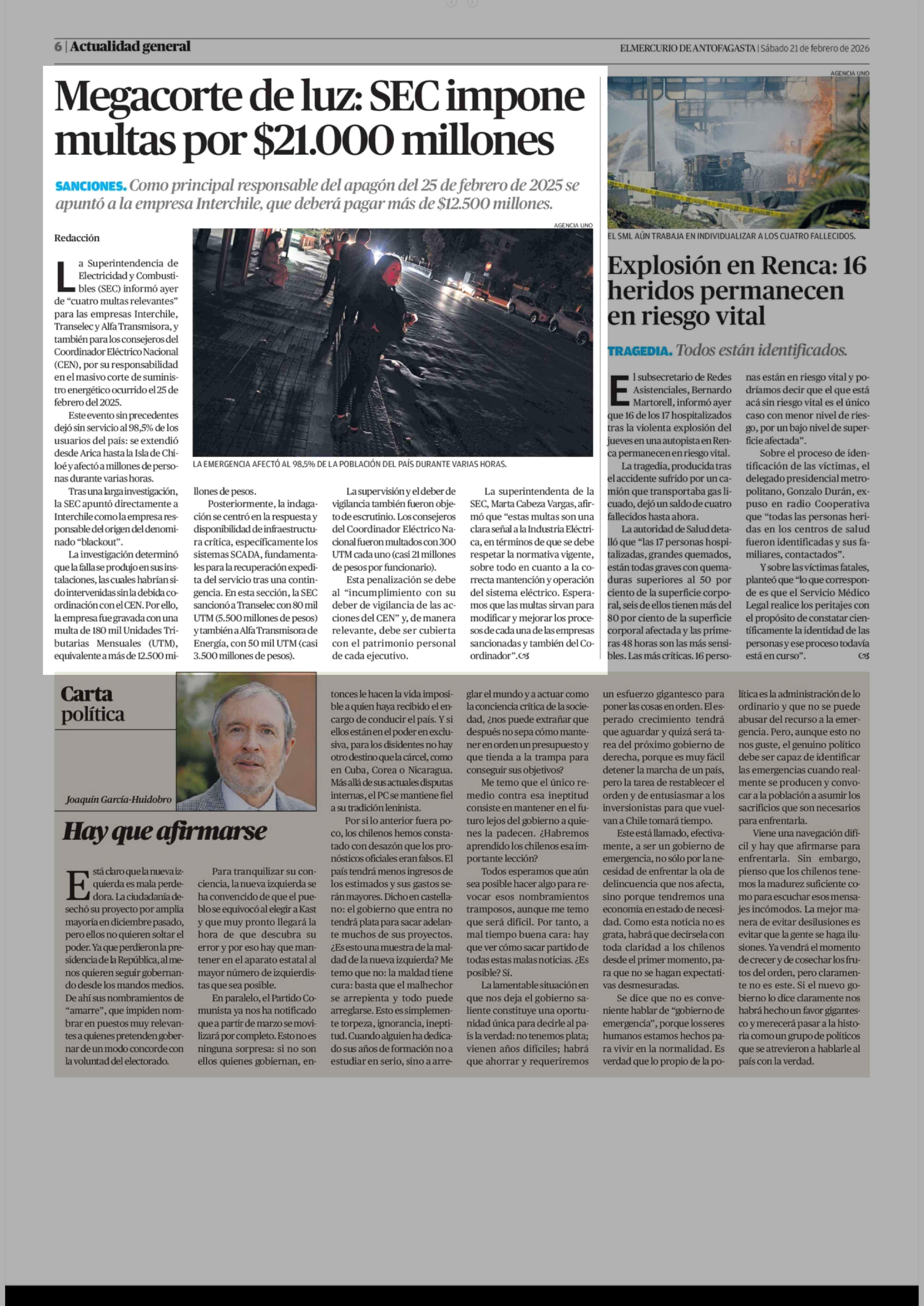 Megacorte de luz: SEC impone multas por $21.000 millones 21-02-2026 El Mercurio de Antofagasta |