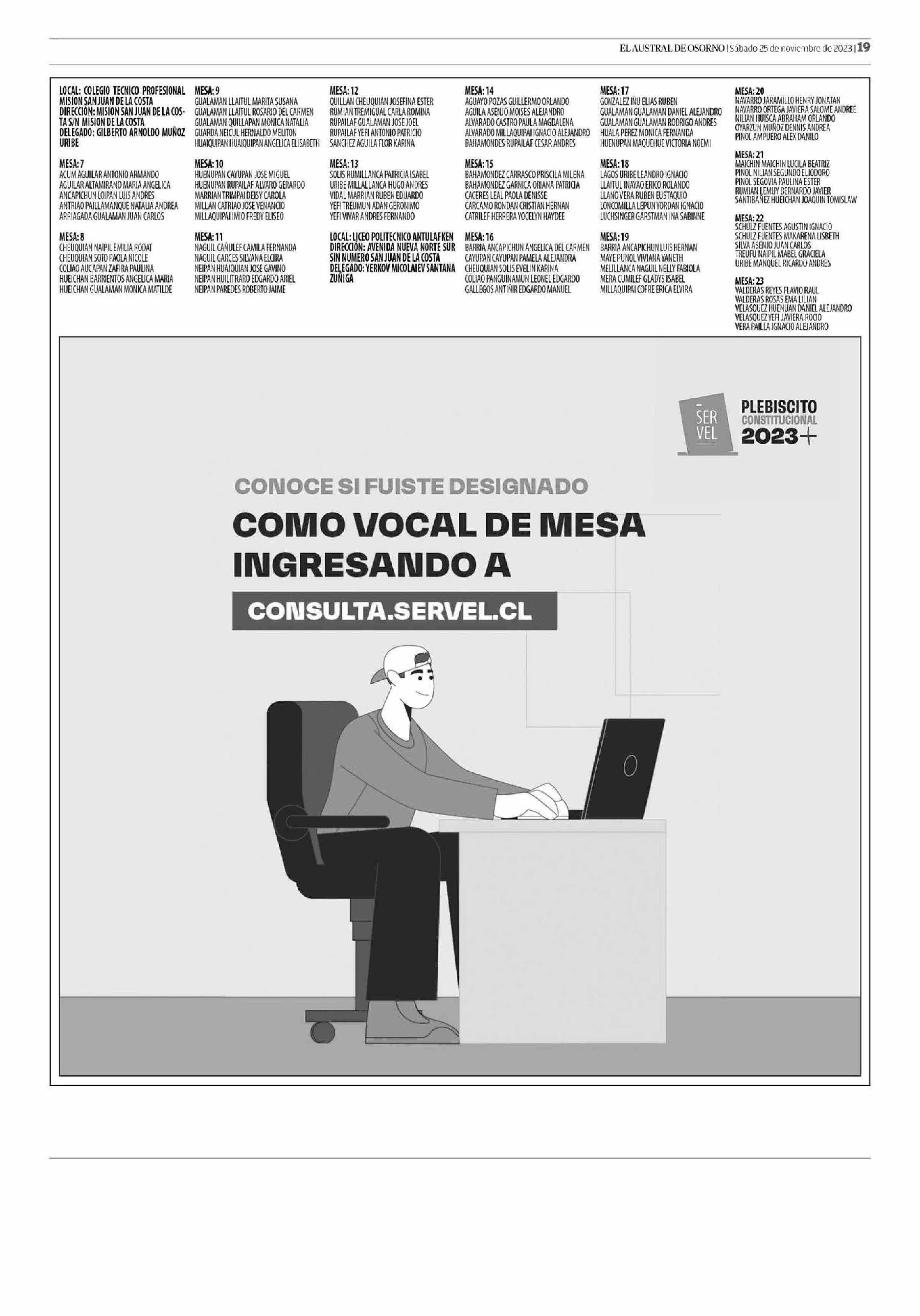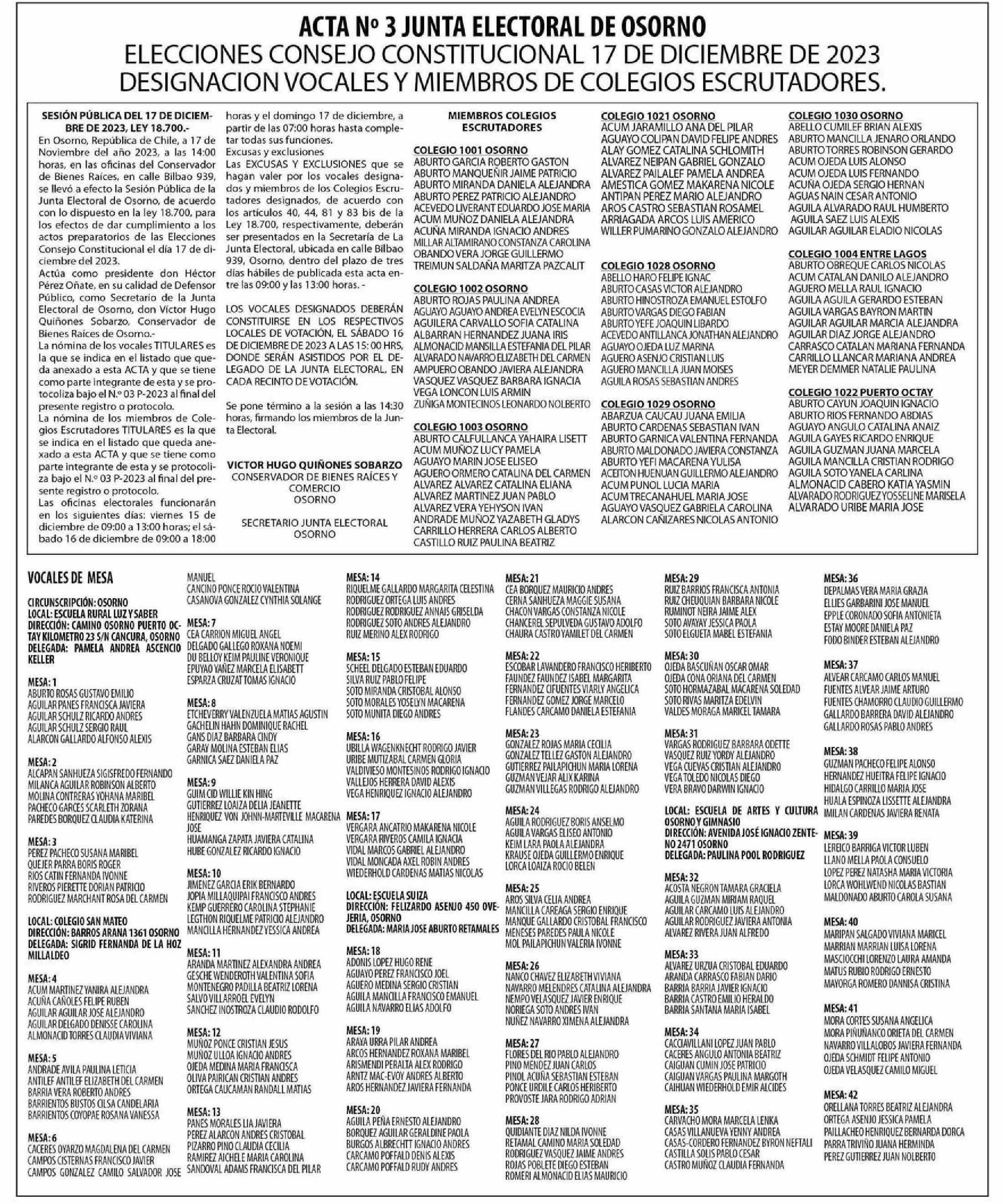 ACTA No 3 JUNTA ELECTORAL DE OSORNO ELECCIONES CONSEJO CONSTITUCIONAL 17 DE DICIEMBRE DE 2023 DESIGNACION VOCALES Y MIEMBROS DE COLEGIOS ESCRUTADORES. 25-11-2023 El Austral de Osorno |