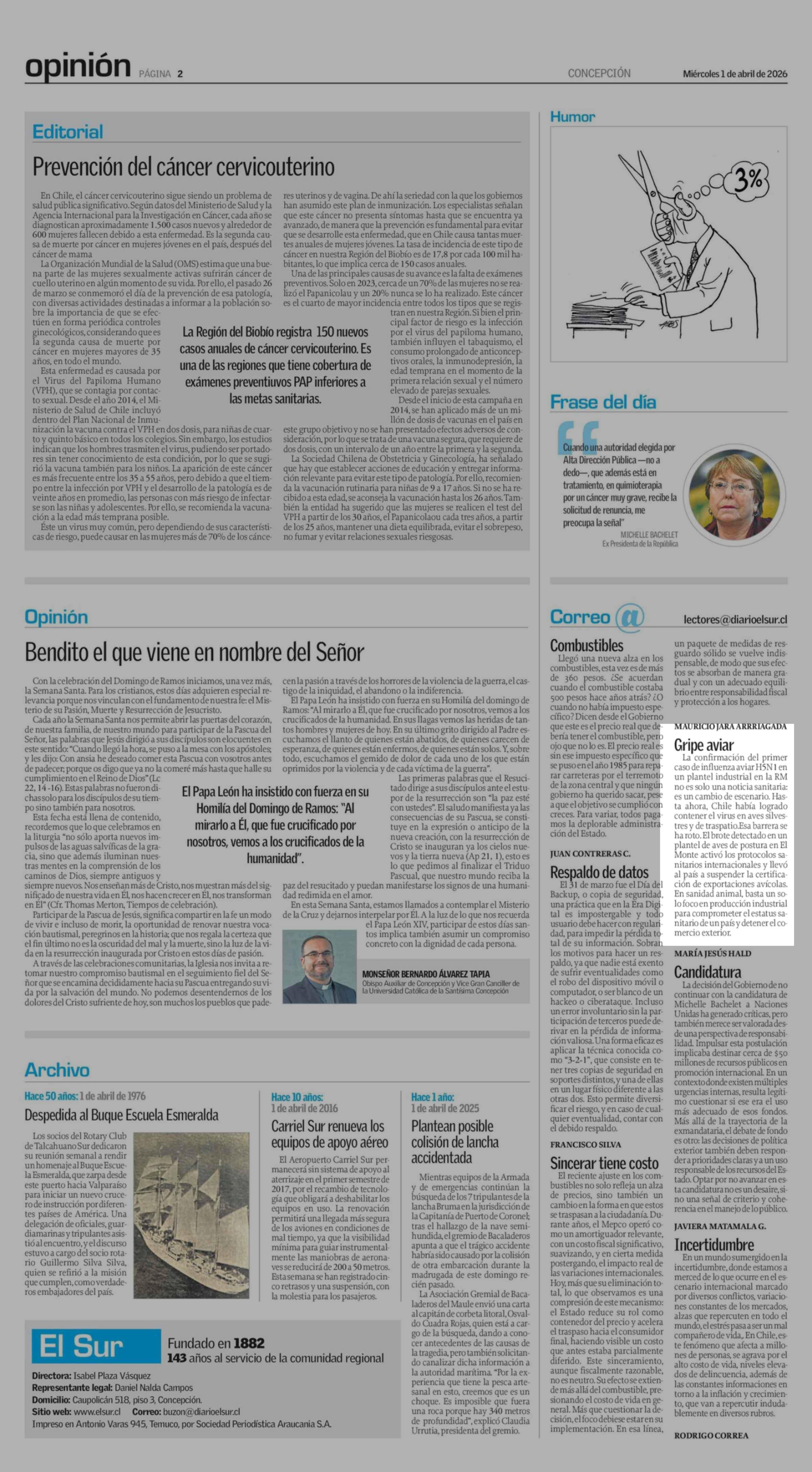 Cartas: Gripe aviar 01-04-2026 El Sur |