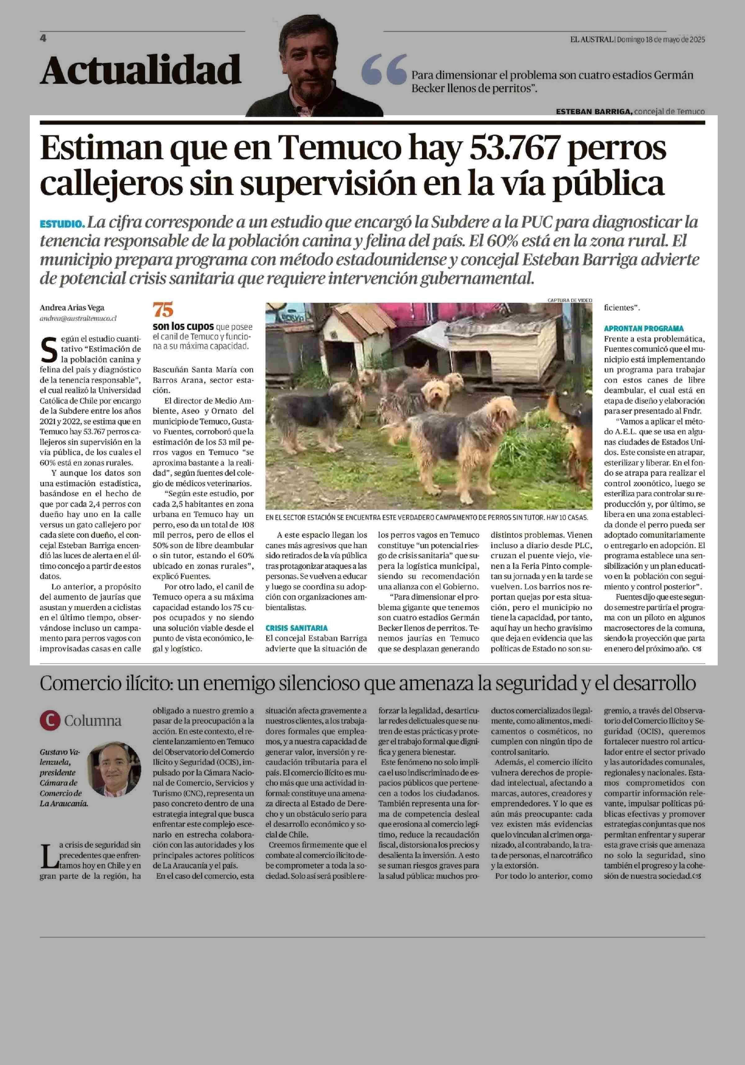 Estiman que en Temuco hay 53.767 perros callejeros sin supervisión en la vía pública 18-05-2025 El Austral de la Araucanía |