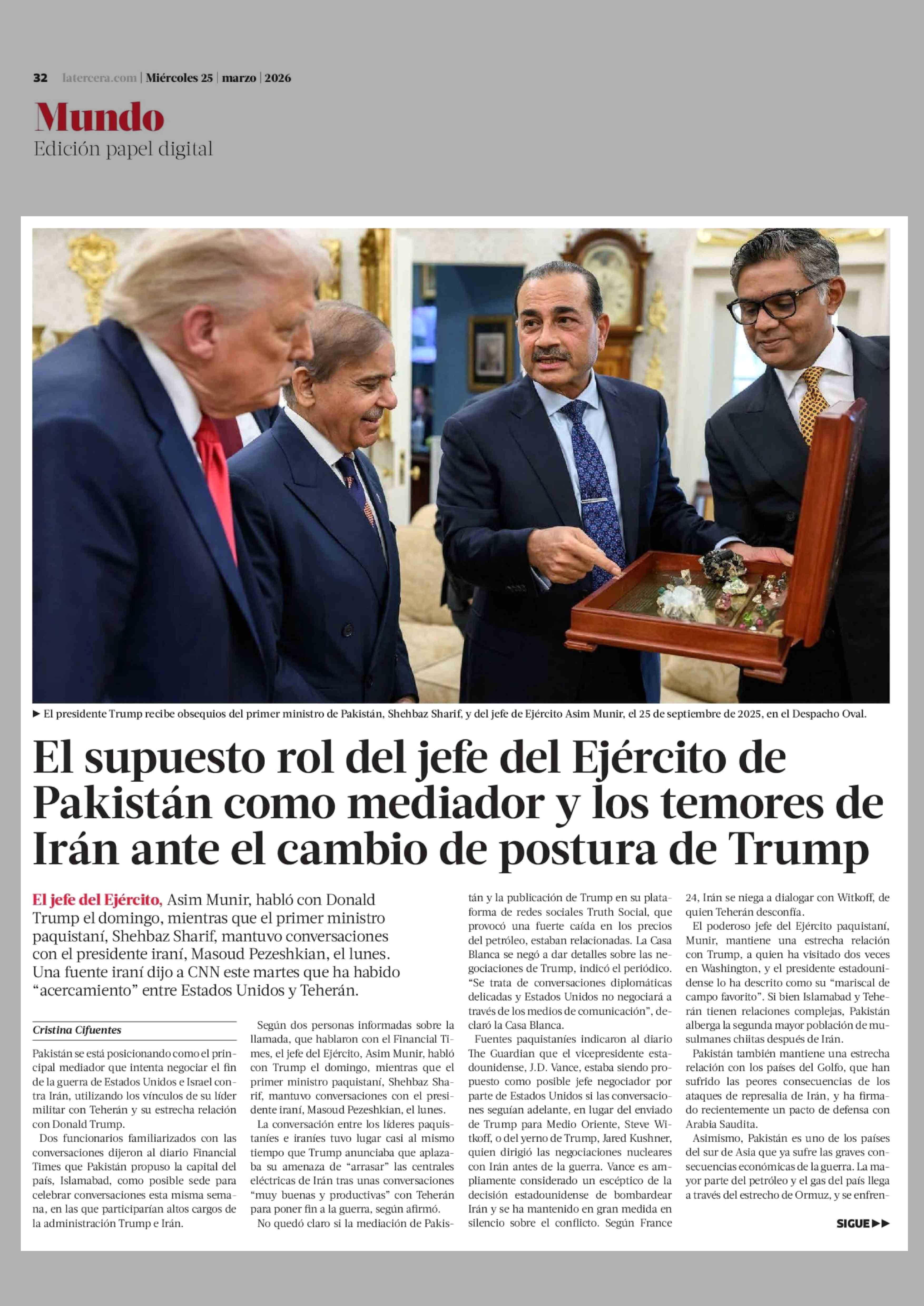 El supuesto rol del jefe del Ejército de Pakistán como mediador y los temores de Irán ante el cambio de postura de Trump 25-03-2026 La Tercera |