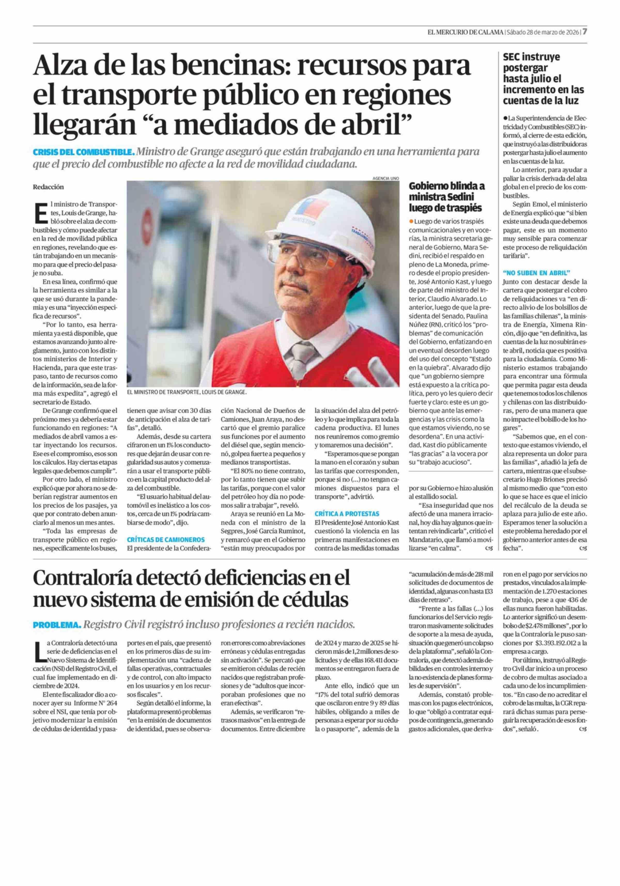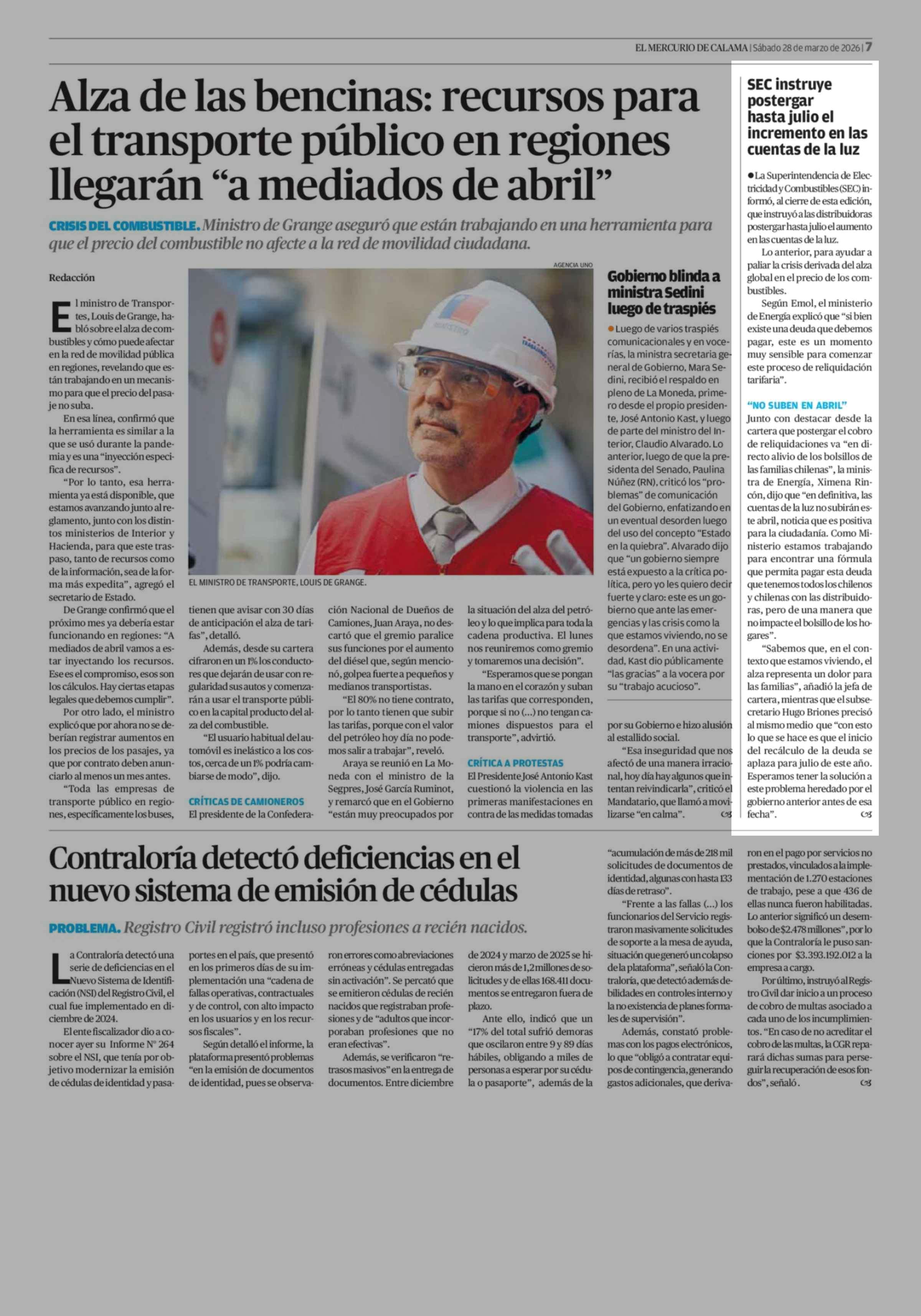 SEC instruye postergar hasta julio el incremento en las cuentas de la luz 28-03-2026 El Mercurio de Calama |