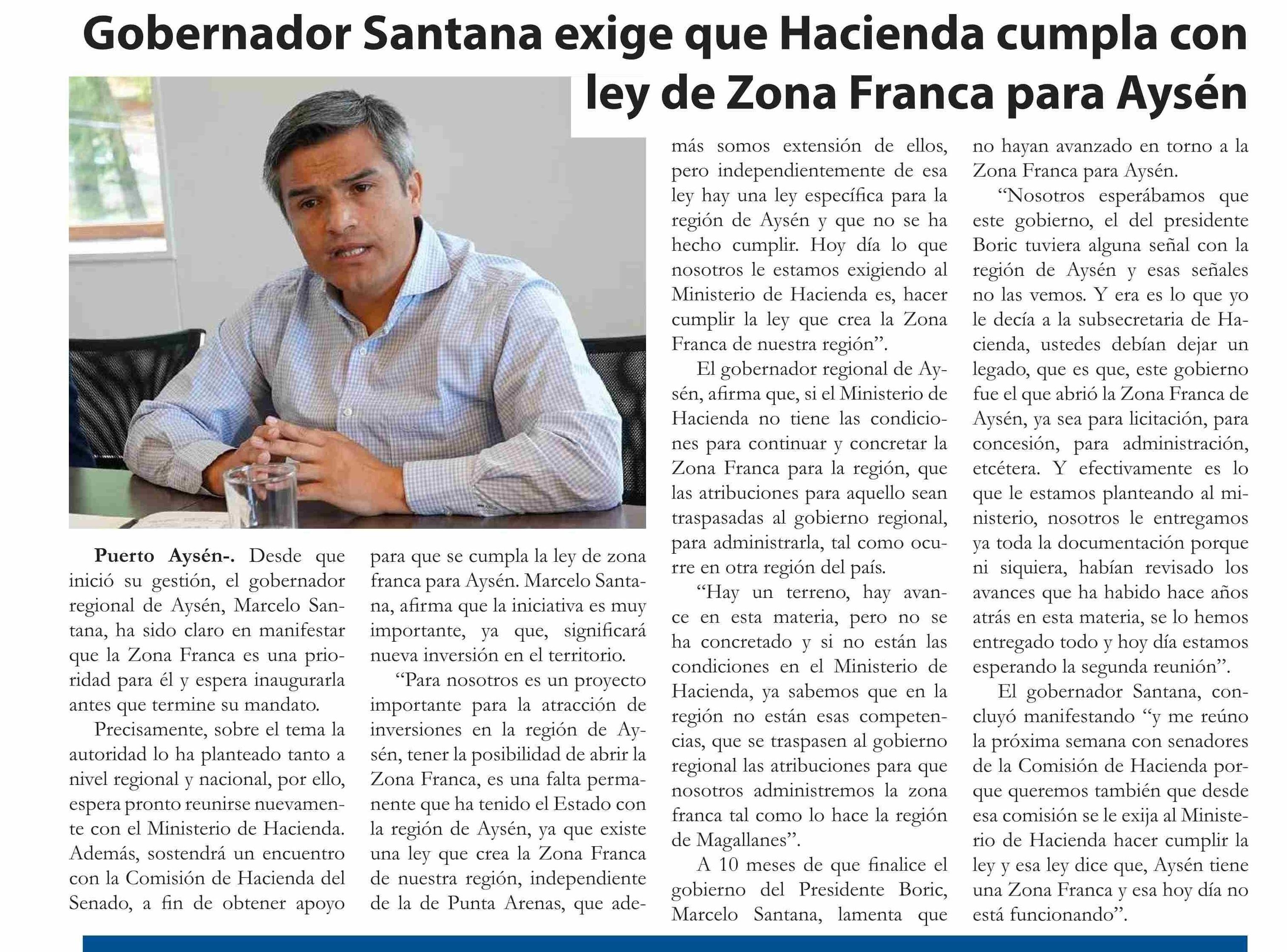 | Título: | Gobernador Santana exige que Hacienda cumpla con ley de Zona Franca para Aysén |