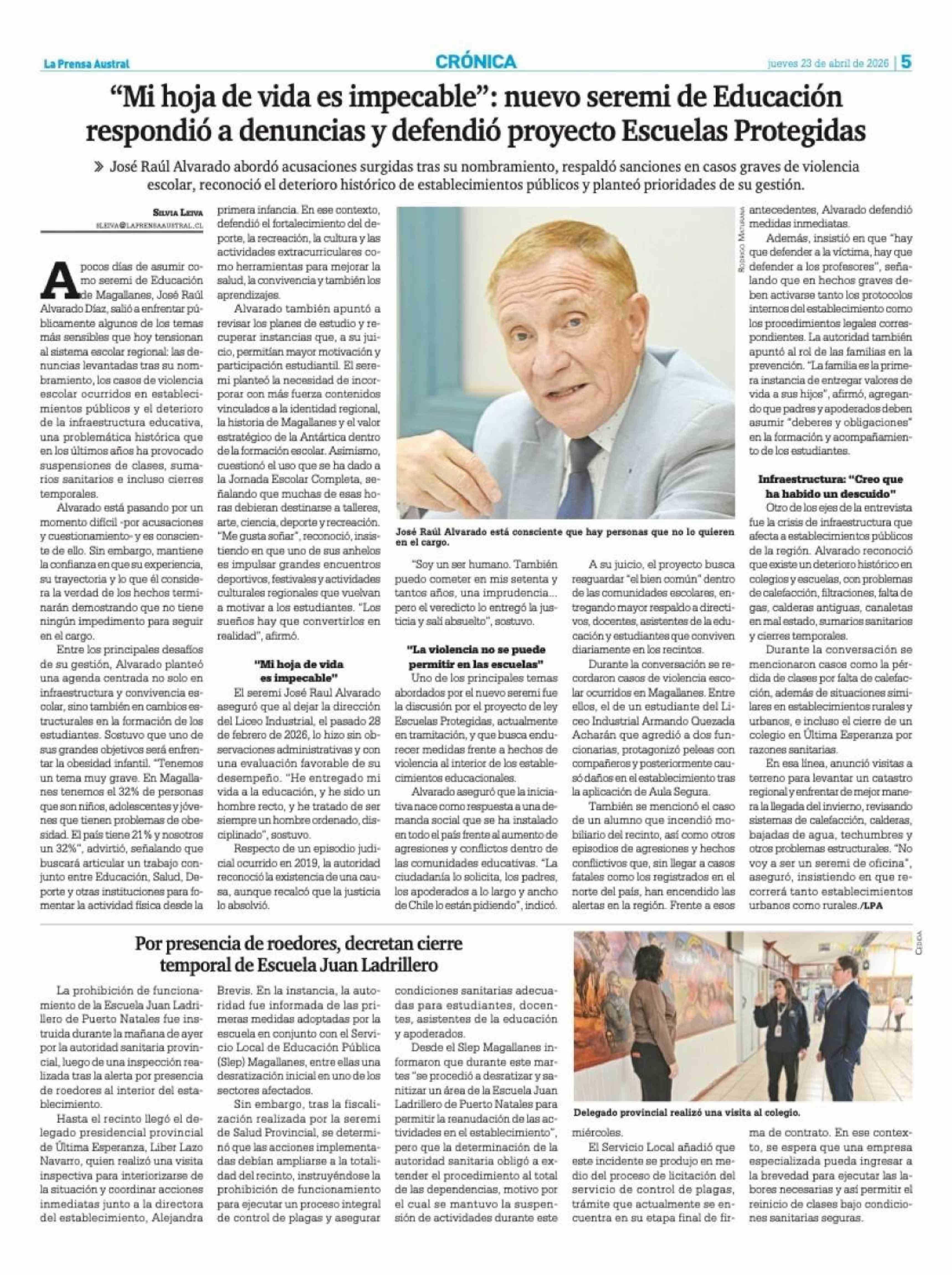 “Mi hoja de vida es impecable”: nuevo seremi de Educación respondió a denuncias y defendió proyecto Escuelas Protegidas 23-04-2026 La Prensa Austral |