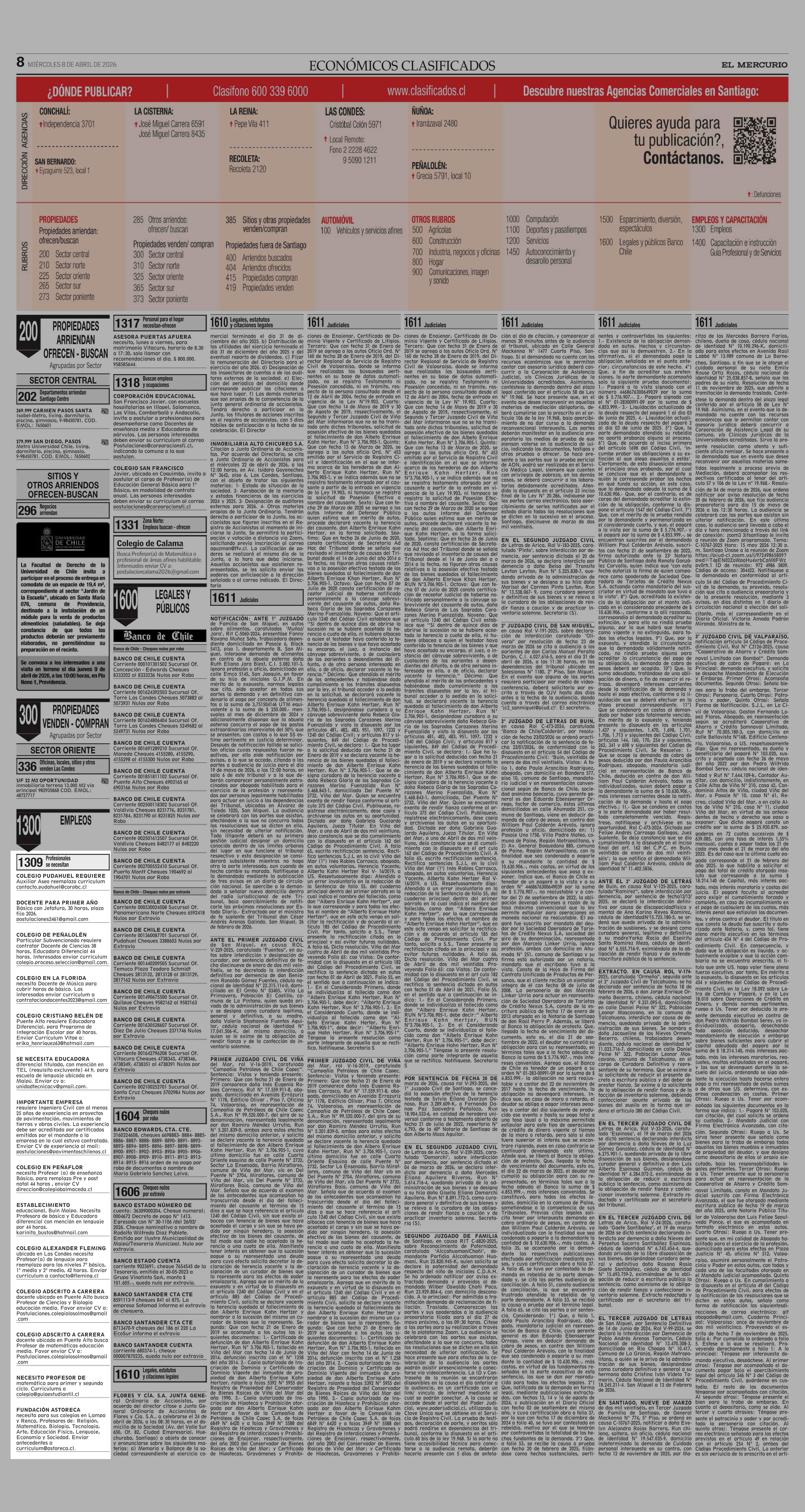 AVISO LICITACIONES: Área Educación 08-04-2026 El Mercurio |