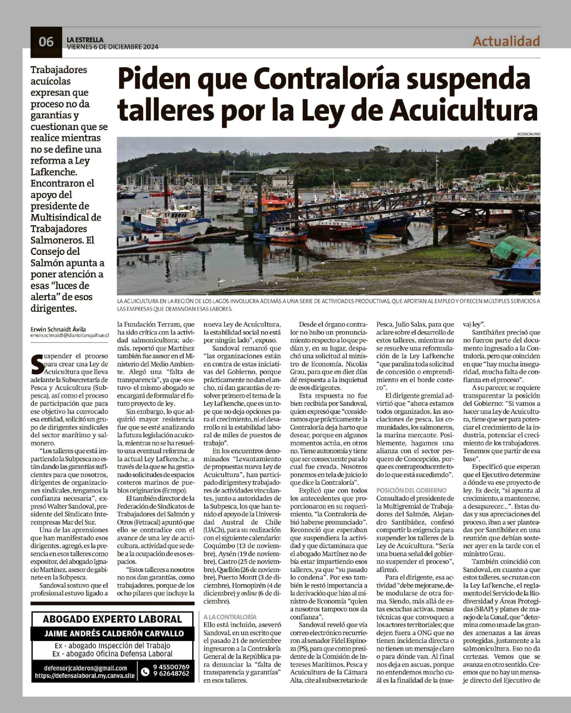 Piden que Contraloría suspenda talleres por la Ley de Acuicultura 06-12-2024 La Estrella de Chiloé |