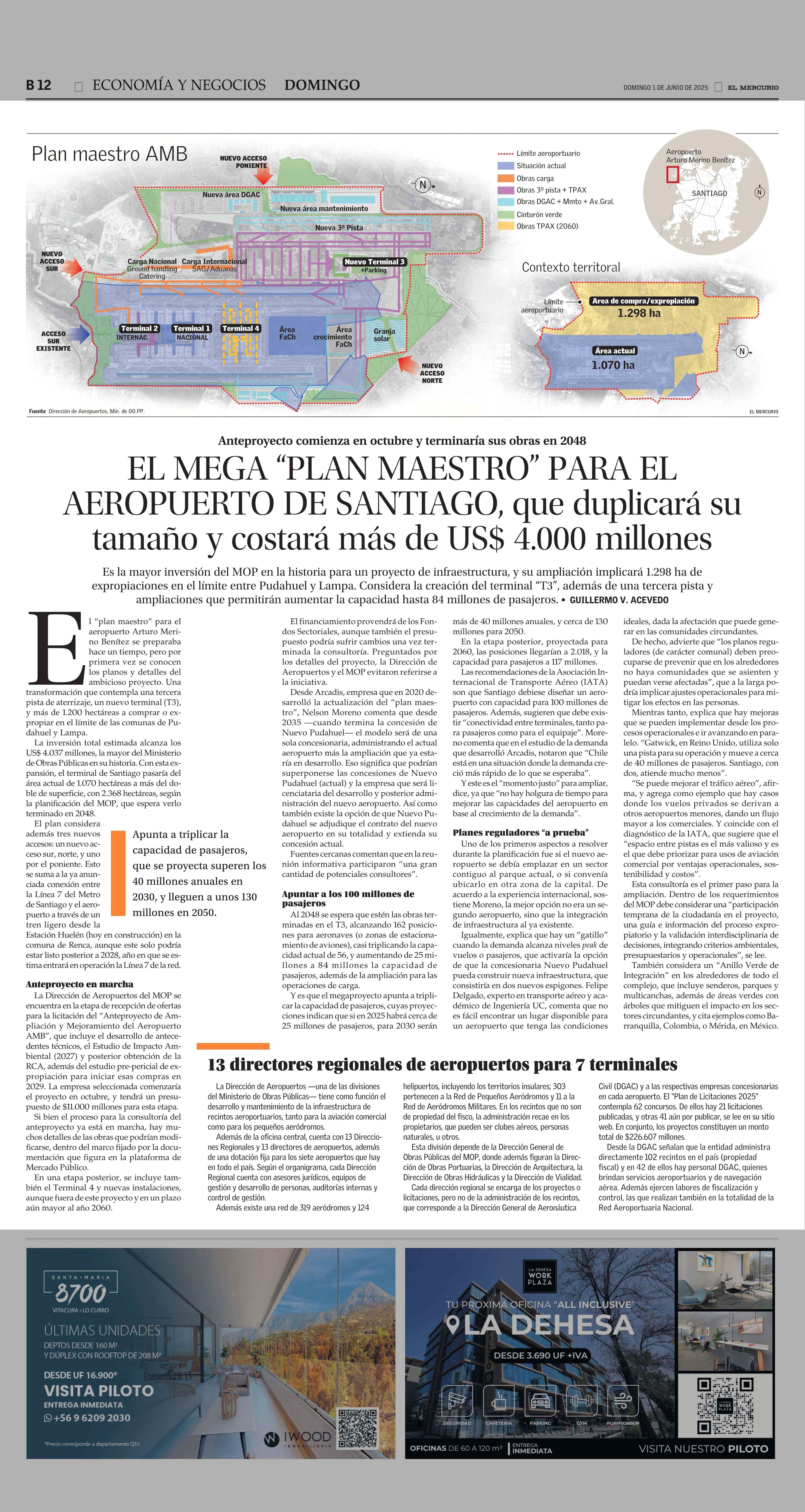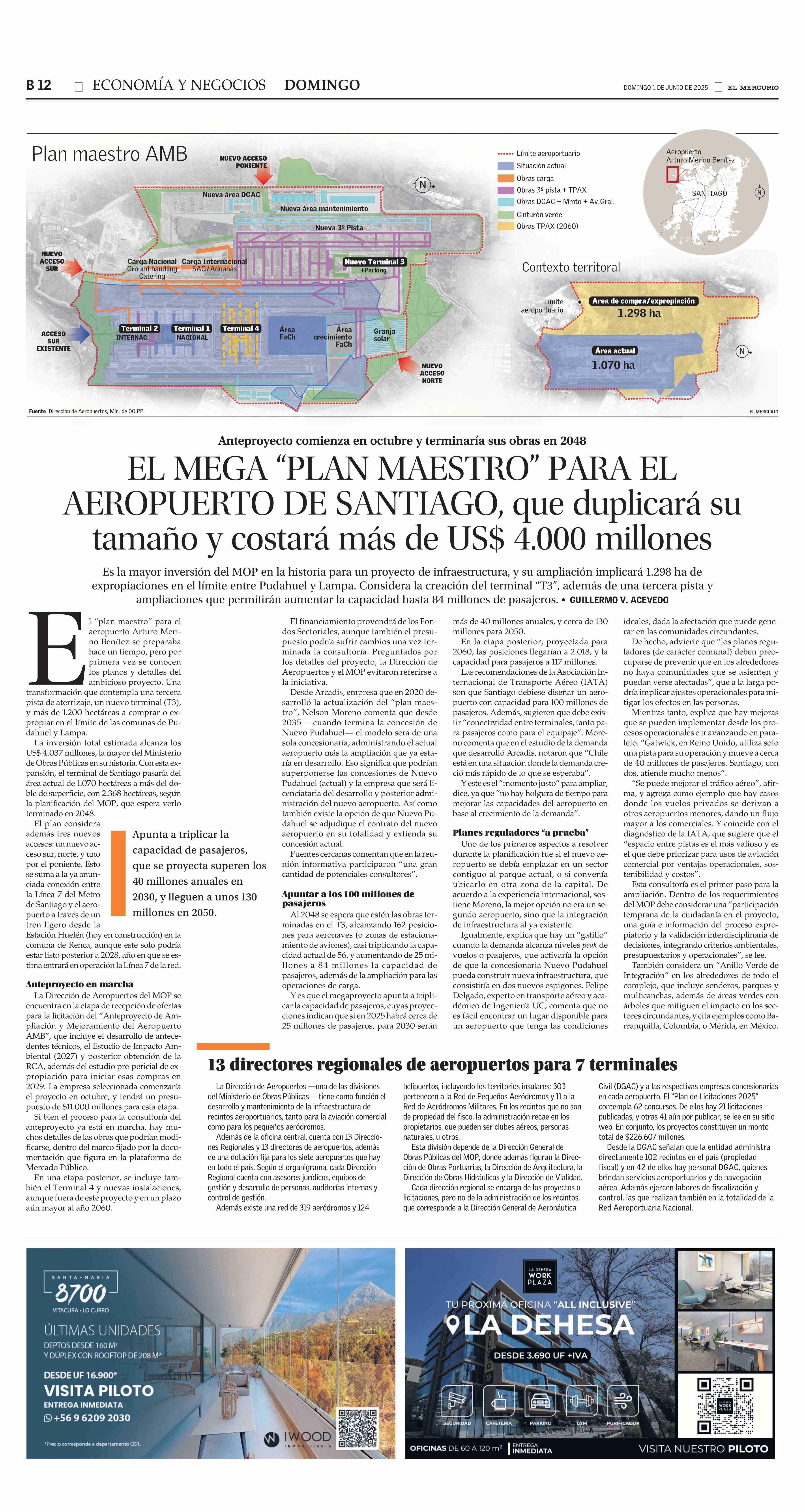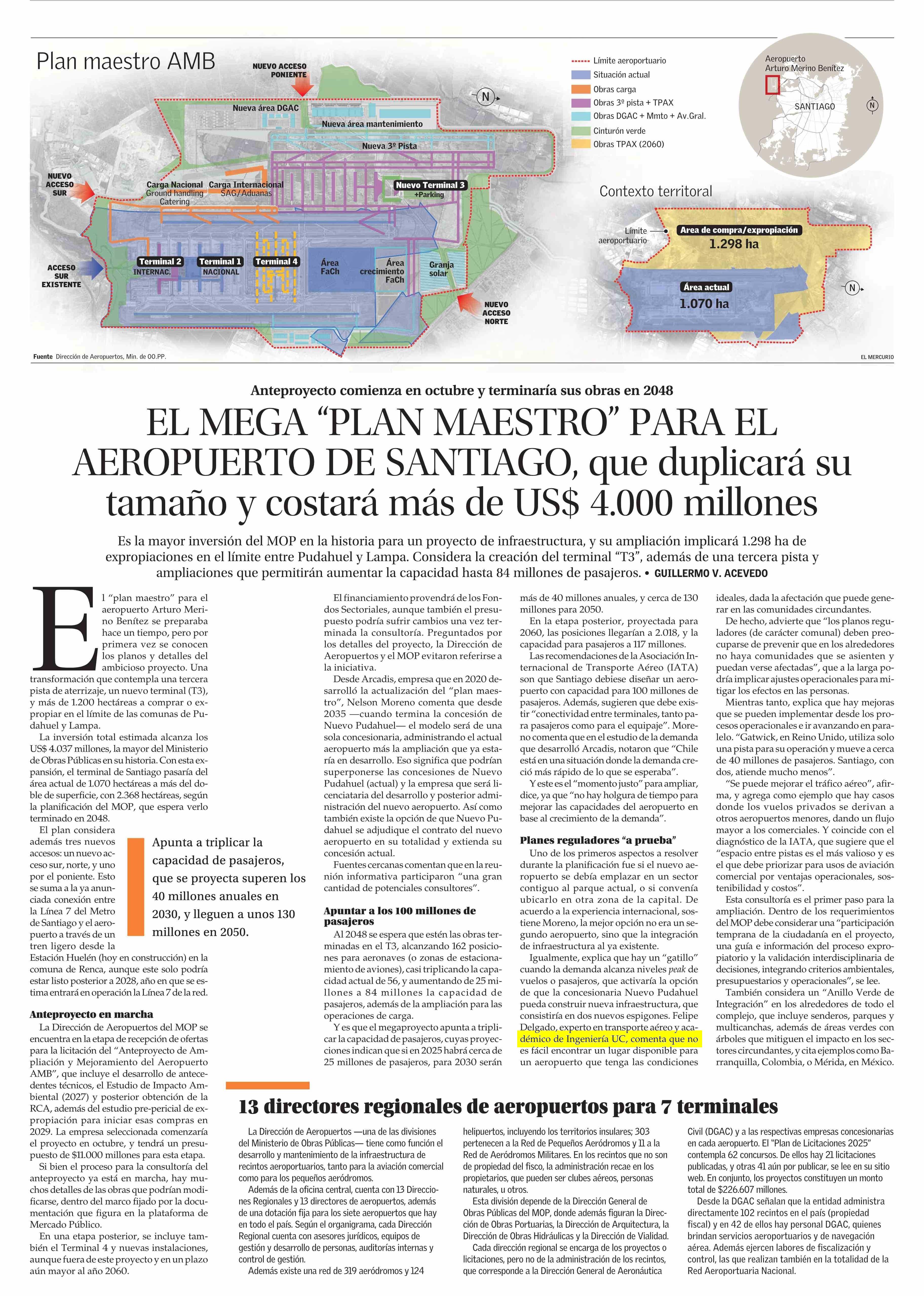 EL MEGA “PLAN MAESTRO” PARA EL AEROPUERTO DE SANTIAGO, que duplicará su tamaño y costará más de US$ 4.000 millones 01-06-2025 El Mercurio |