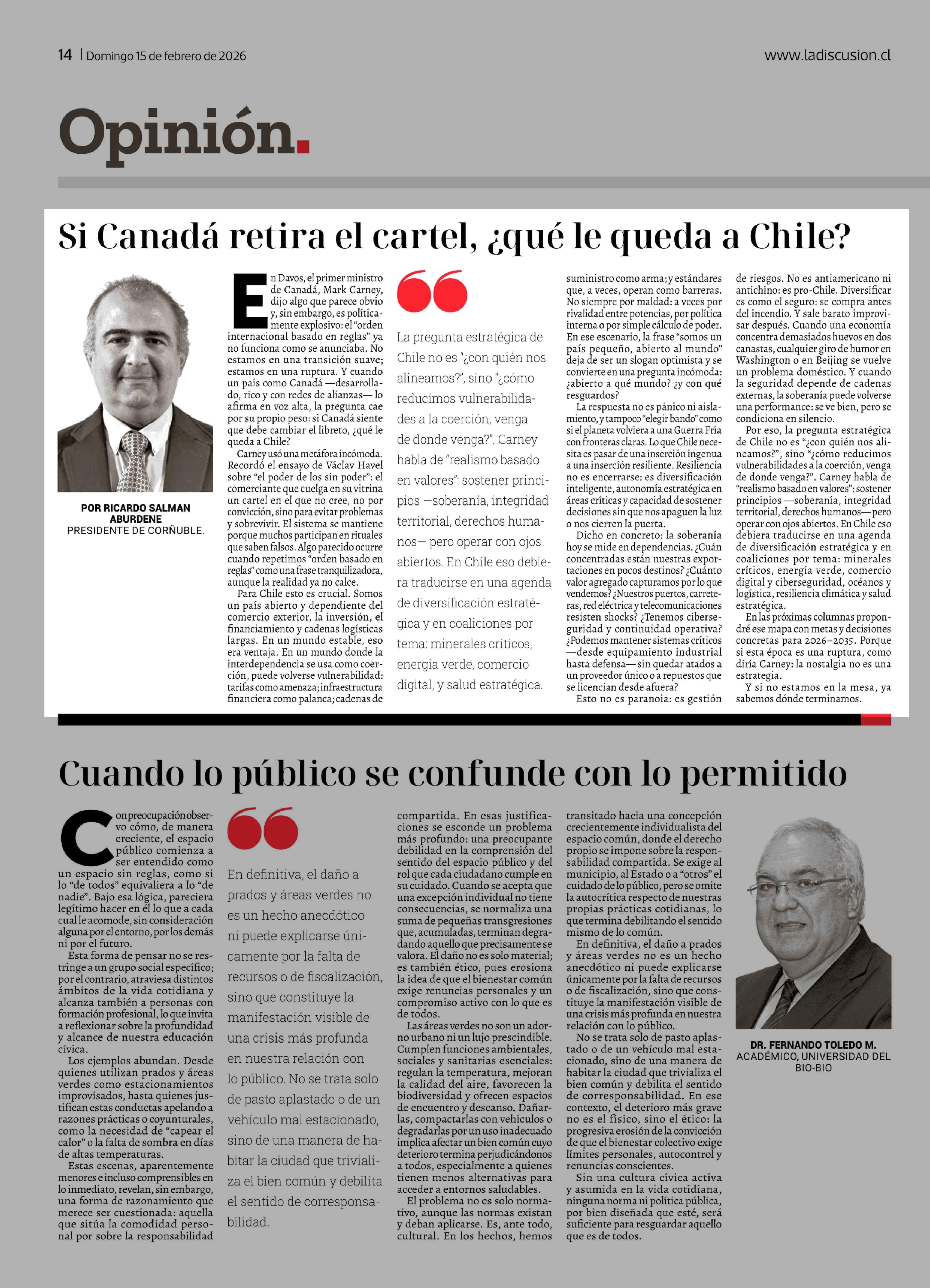 Columnas de Opinión: Si Canadá retira el cartel, ¿qué le queda a Chile? 15-02-2026 La Discusión |