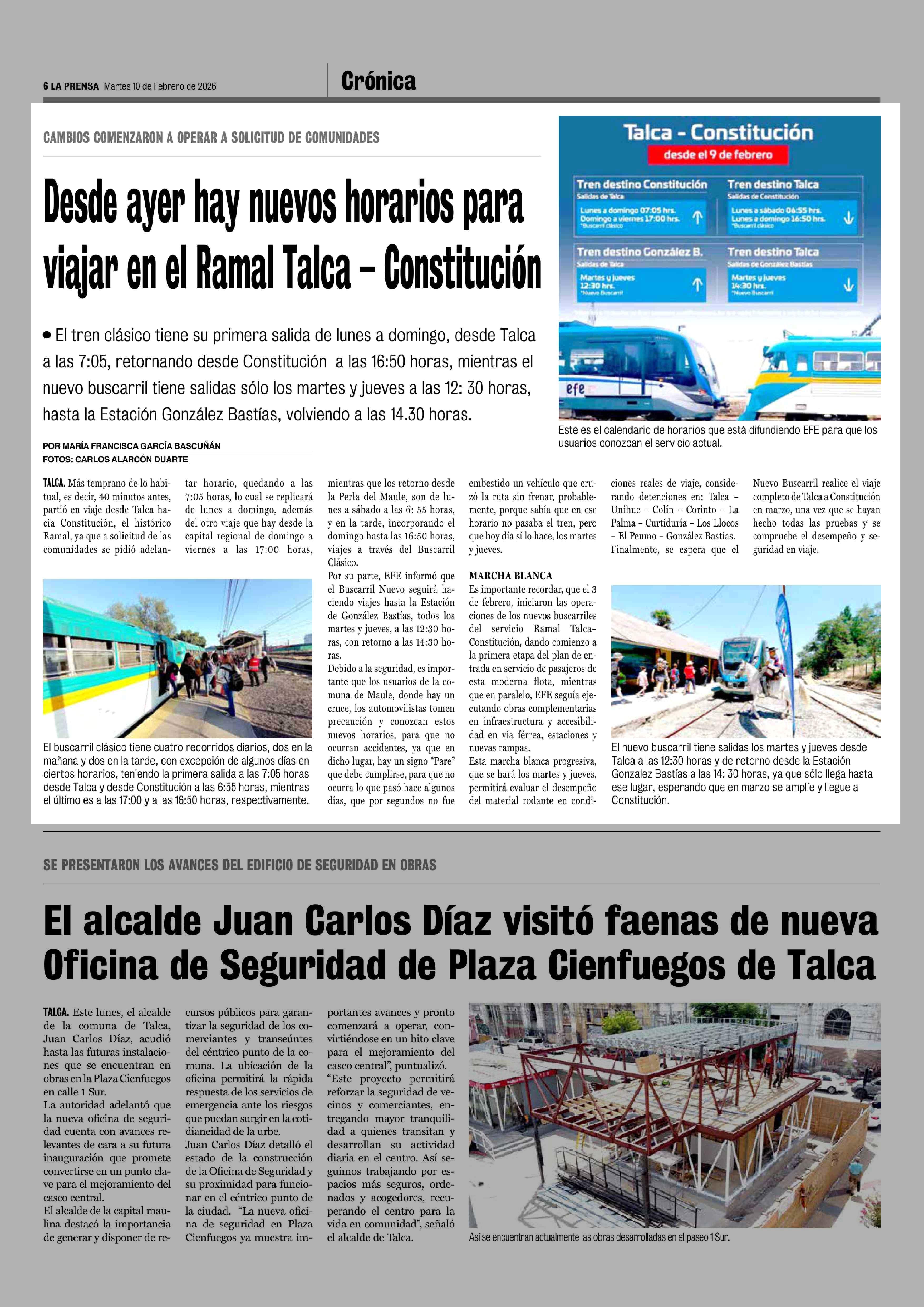 Desde ayer hay nuevos horarios para viajar en el Ramal Talca - Constitución 10-02-2026 La Prensa de Curicó |