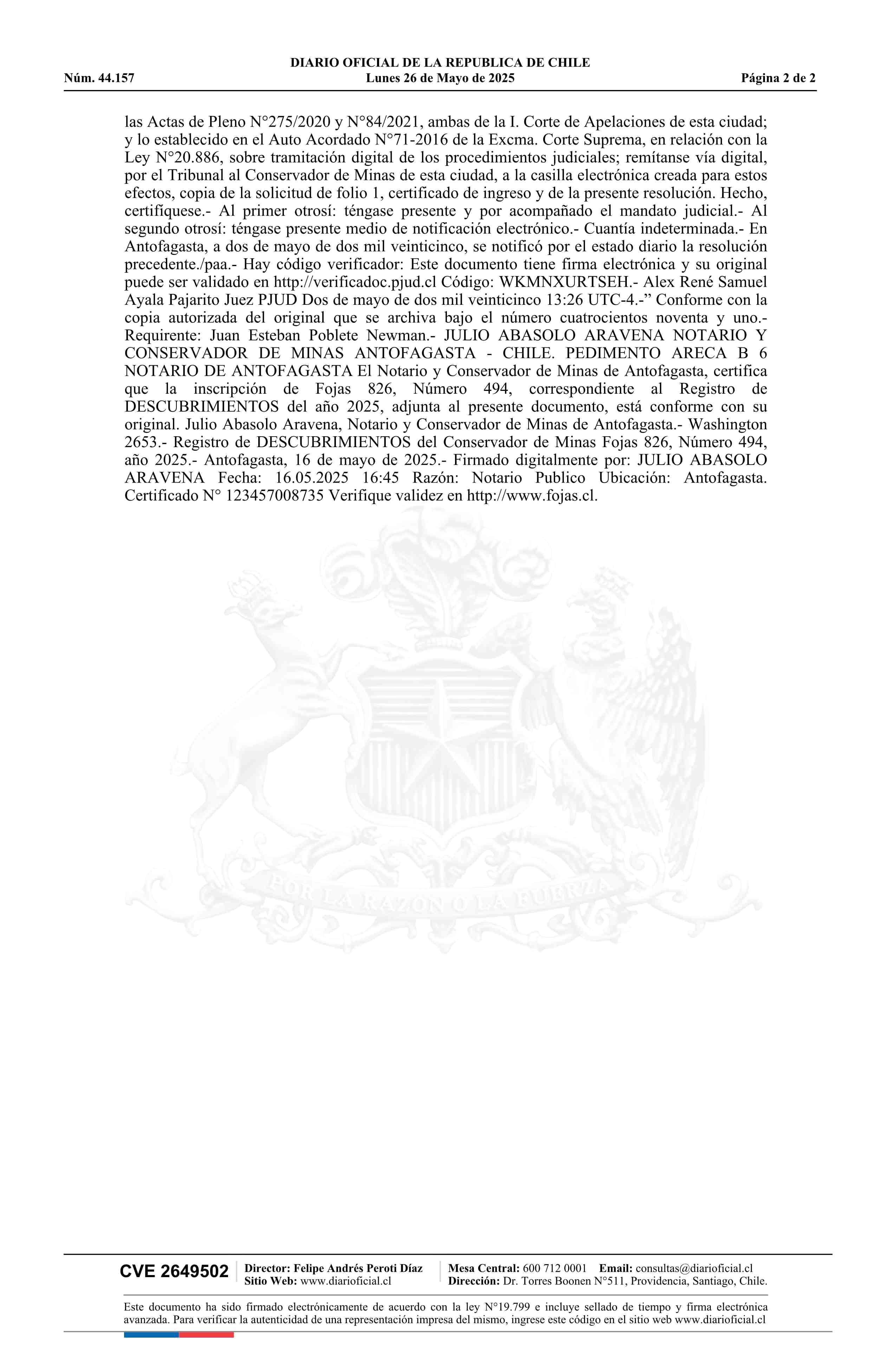 ARECA B 6 / Antofagasta Minerals S.A. 26-05-2025 DIARIO OFICIAL CHILE - BOLETÍN OFICIAL DE MINERÍA |