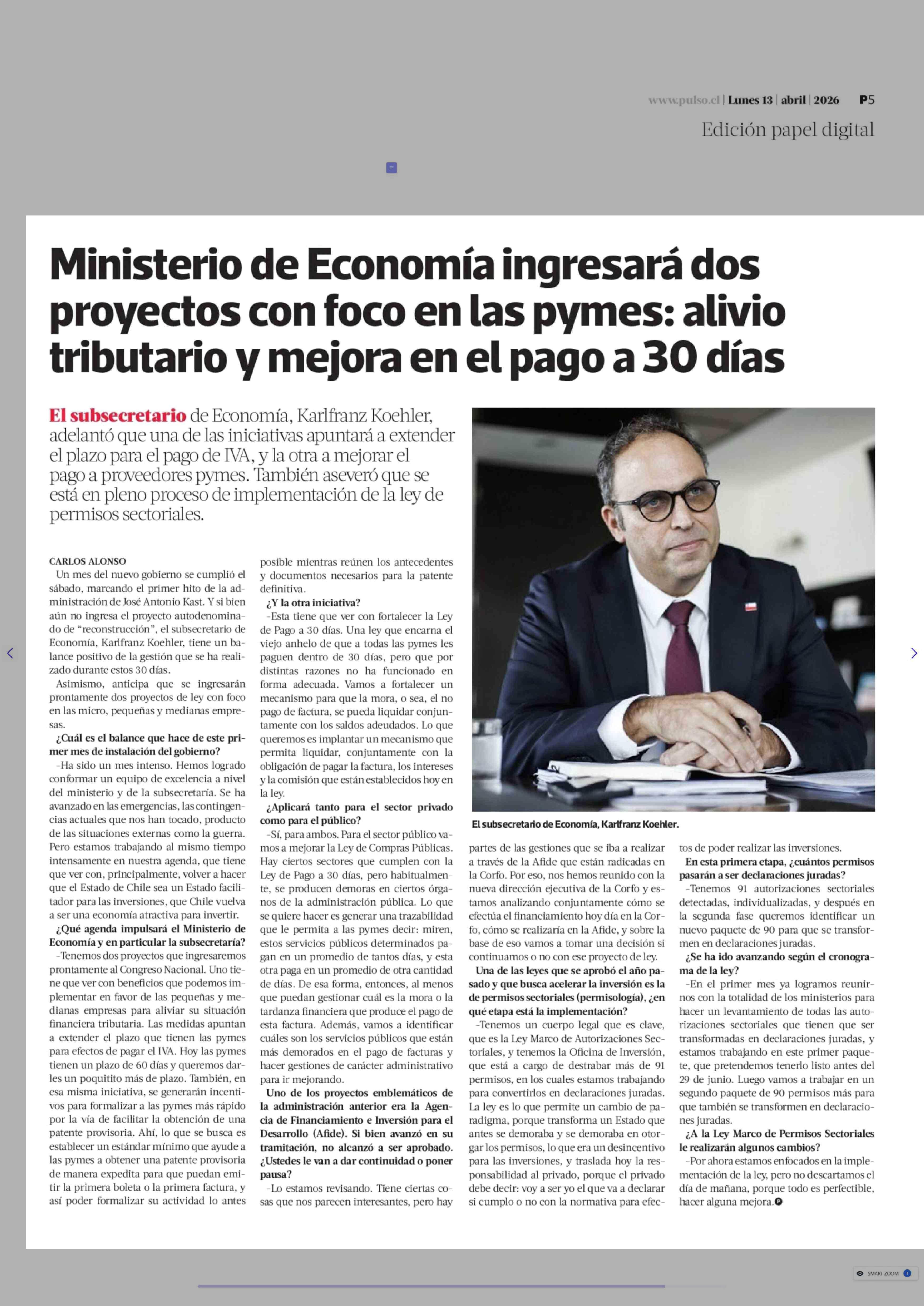 Ministerio de Economía ingresará dos proyectos con foco en las pymes: alivio tributario y mejora en el pago a 30 días 13-04-2026 La Tercera |
