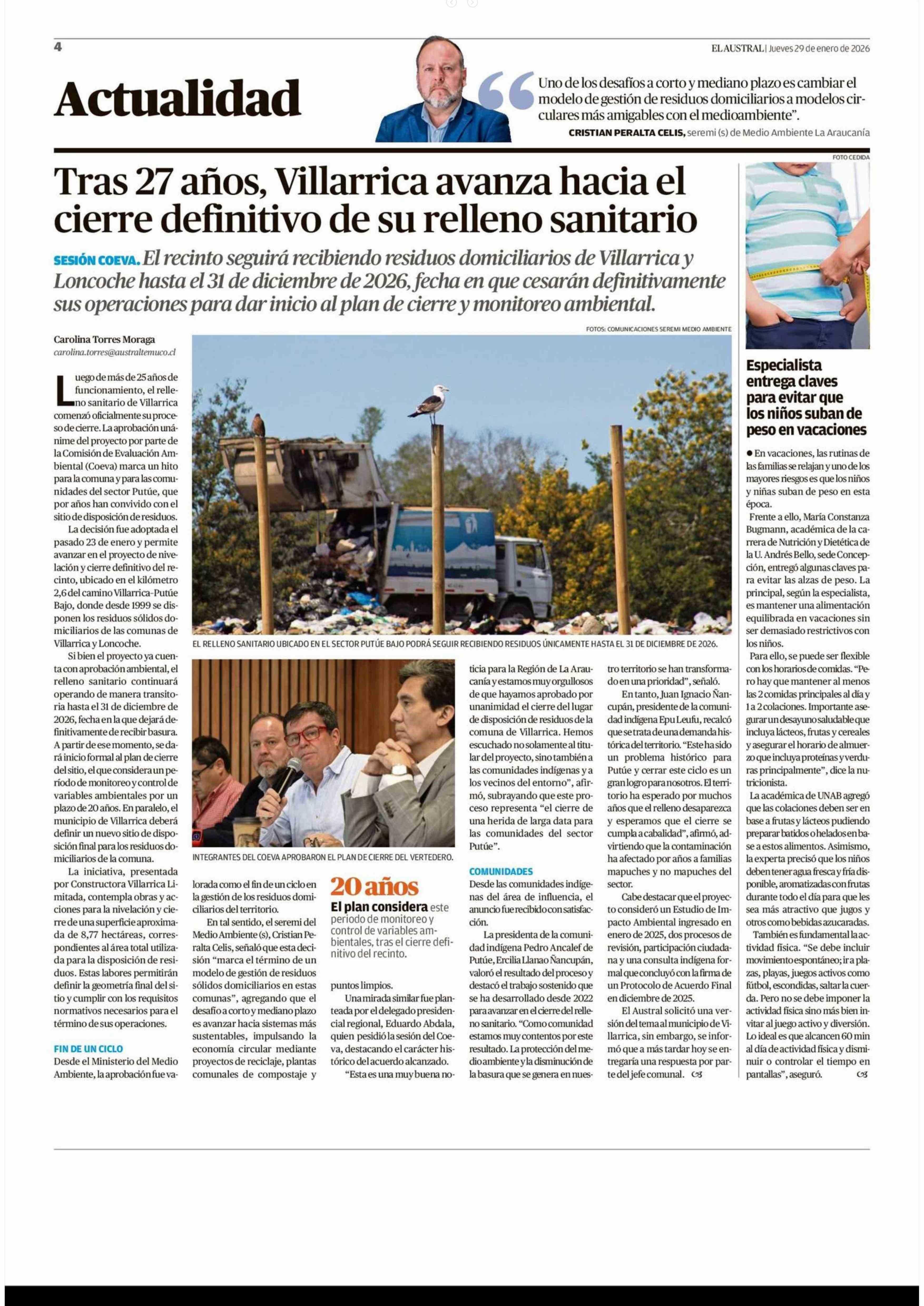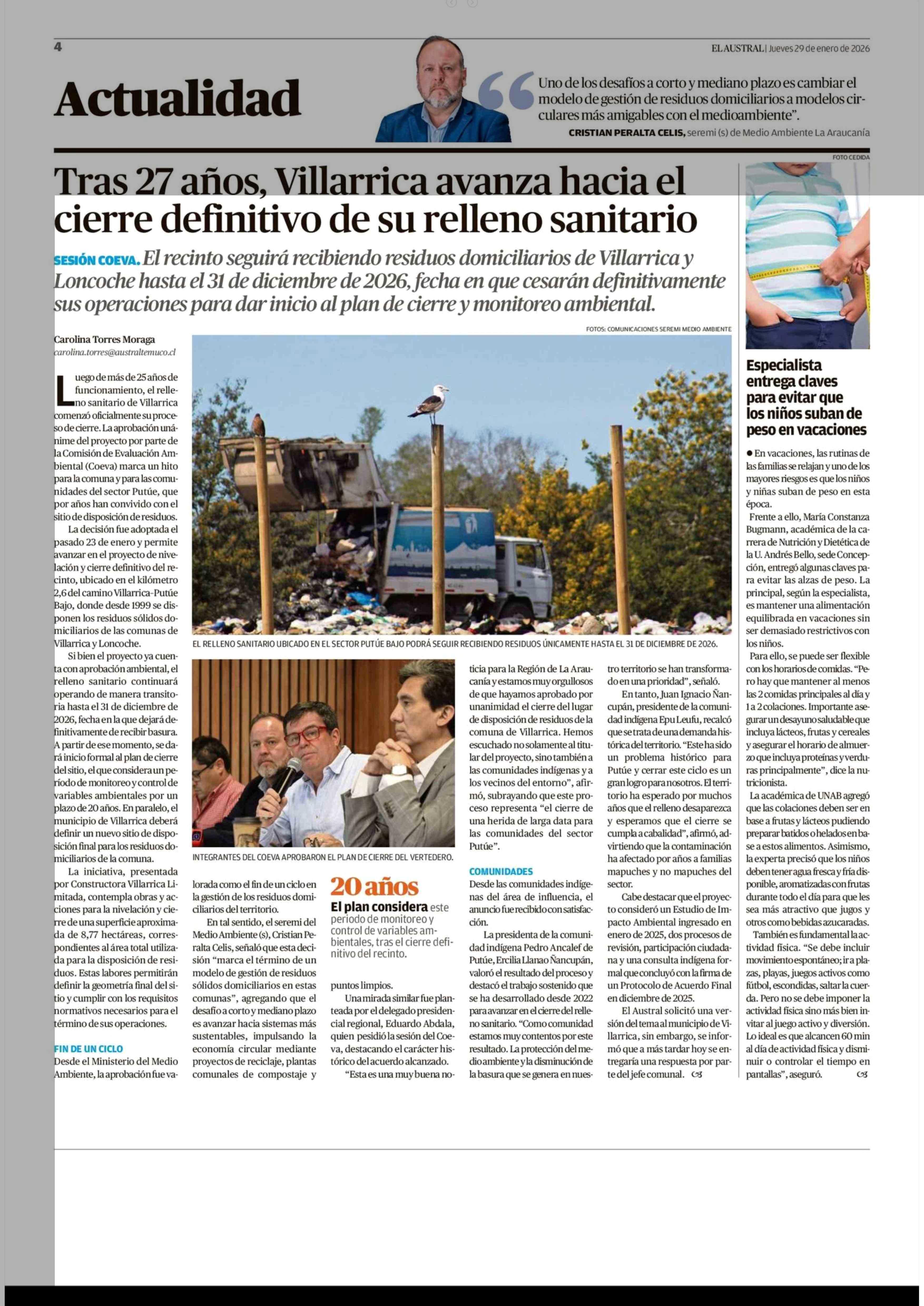 Tras 27 años, Villarrica avanza hacia el cierre definitivo de su relleno sanitario 29-01-2026 El Austral de la Araucanía |