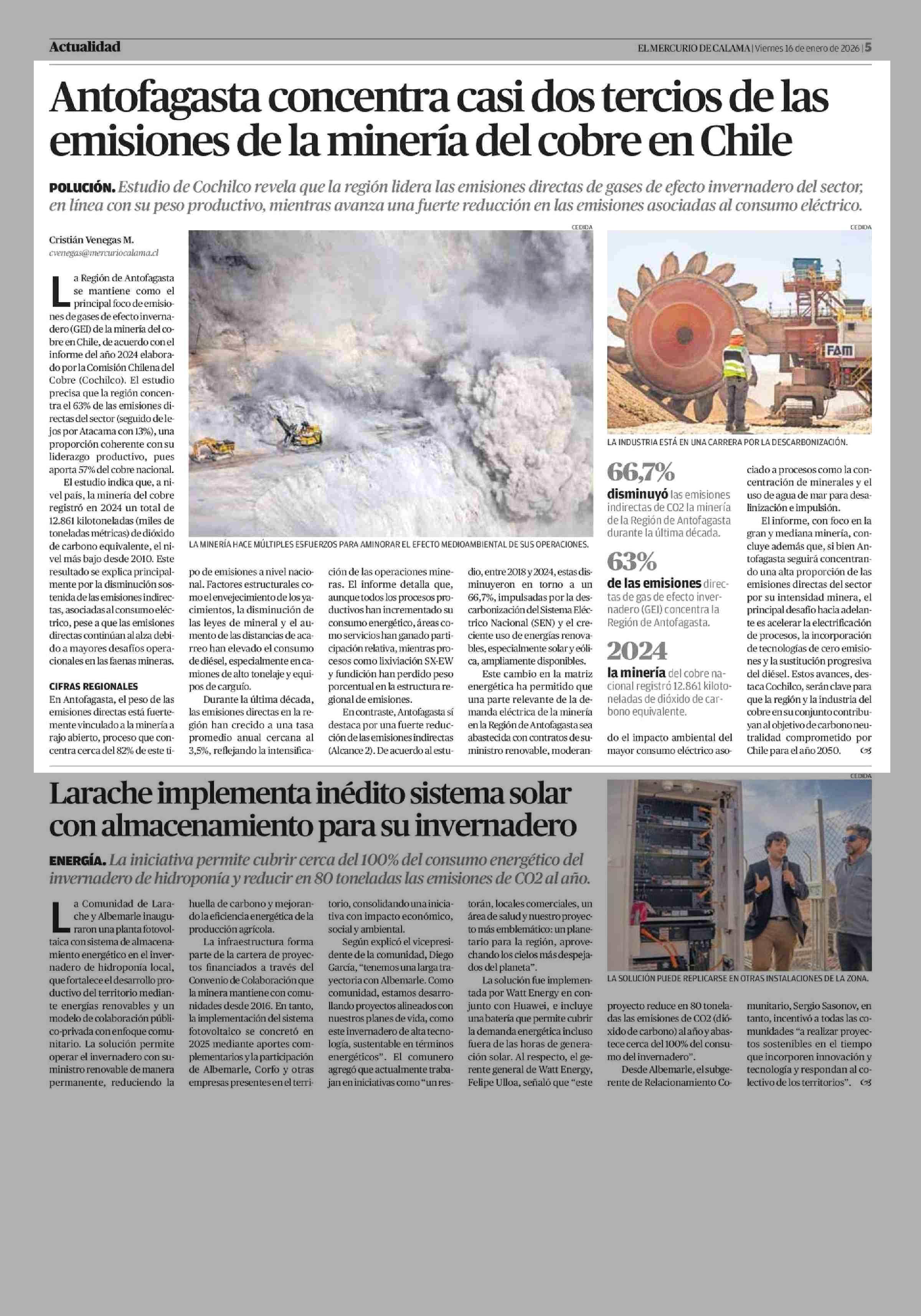 Antofagasta concentra casi dos tercios de las emisiones de la minería del cobre en Chile 16-01-2026 El Mercurio de Calama |
