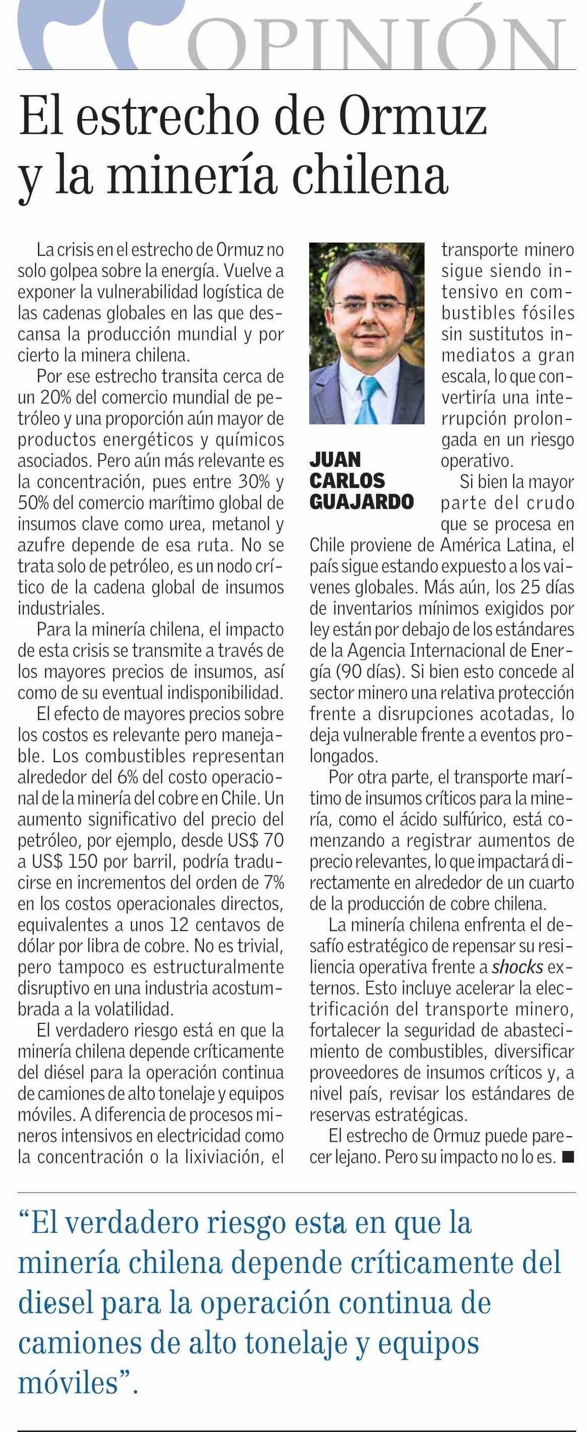 Columnas de Opinión: OPINIÓN El estrecho de Ormuz y la minería chilena 19-03-2026 El Mercurio |