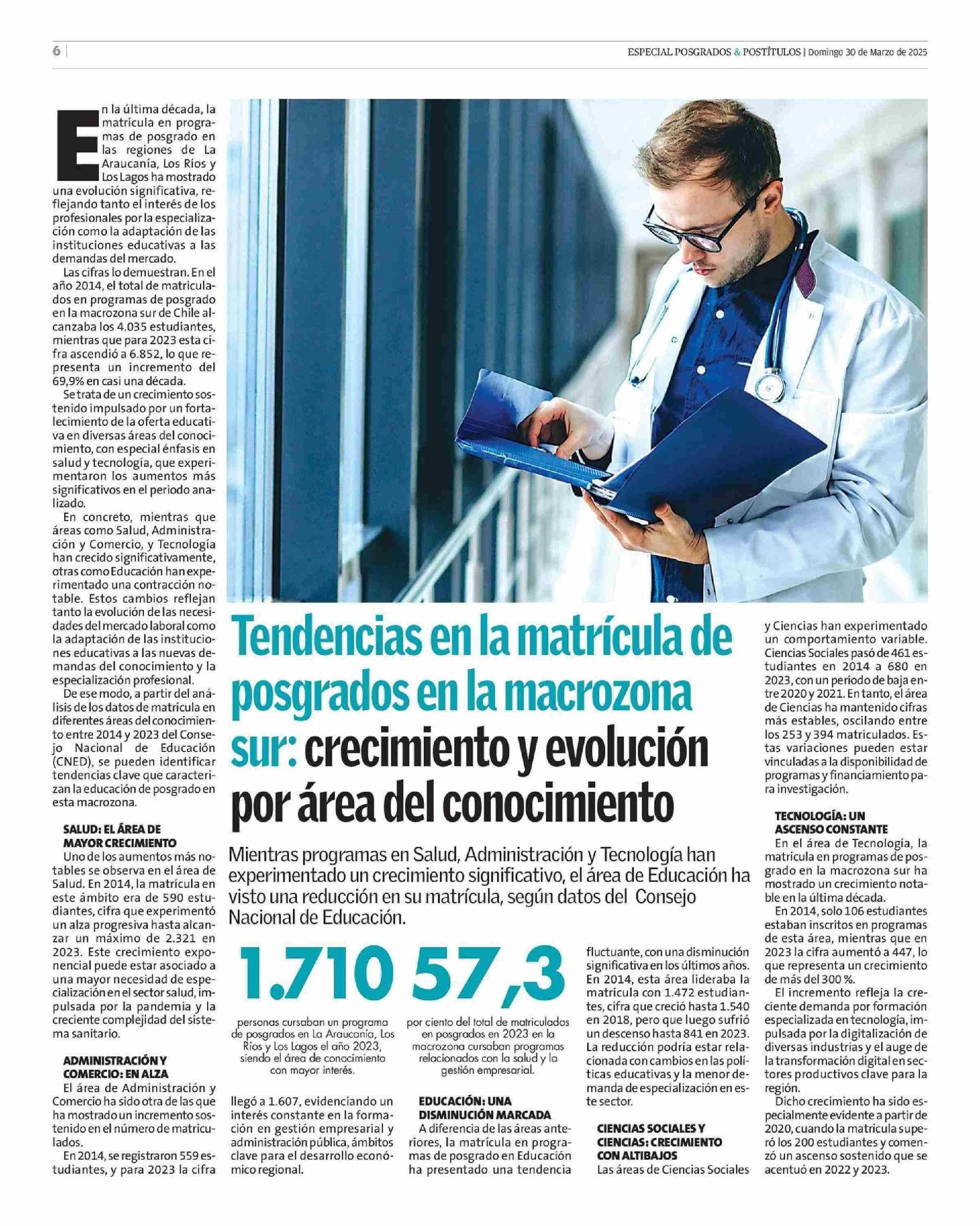 Tendencias en la matrícula de posgrados en la macrozona sur: crecimiento y evolución por área del conocimiento 30-03-2025 El Austral de Osorno |
