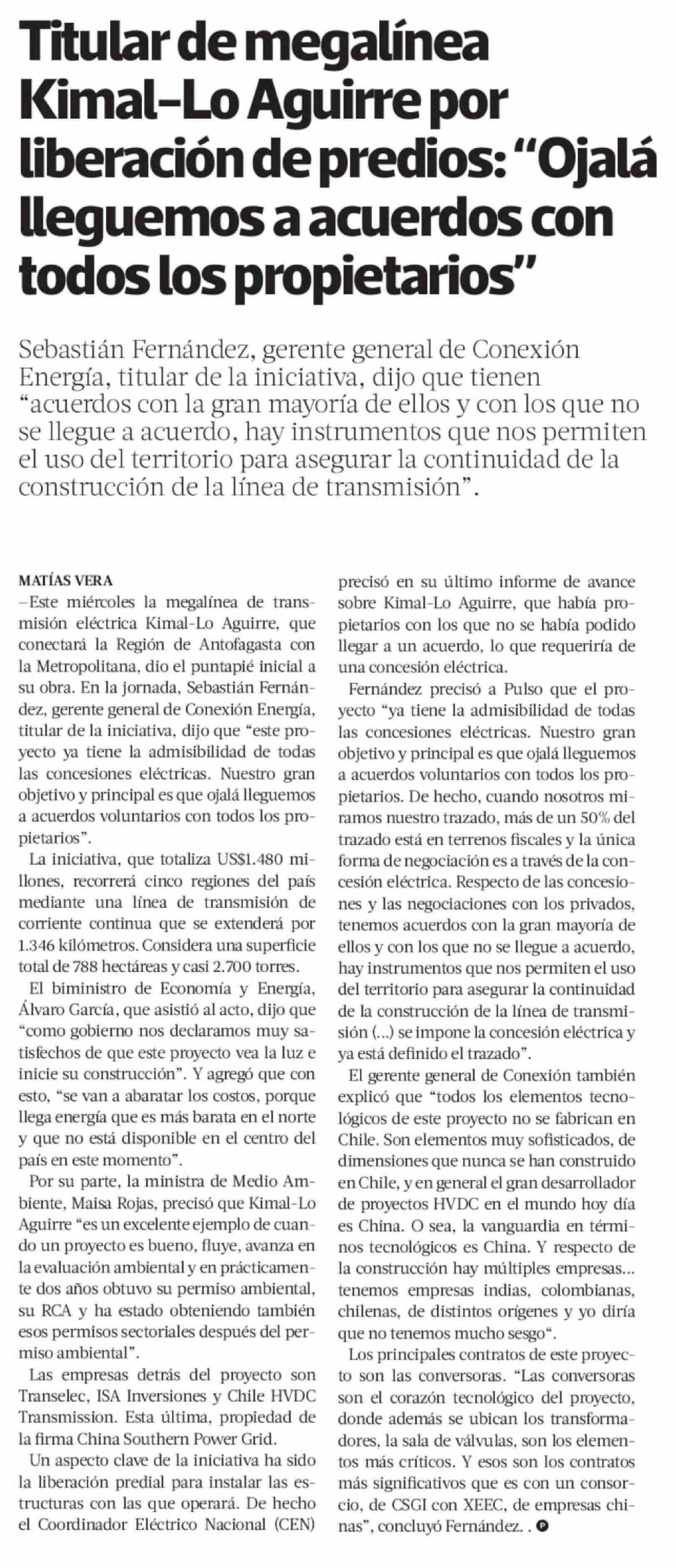 | Título: | Titular de megalínea Kimal-Lo Aguirre por liberación de predios: "Ojalá lleguemos a acuerdos con todos los propietarios" |