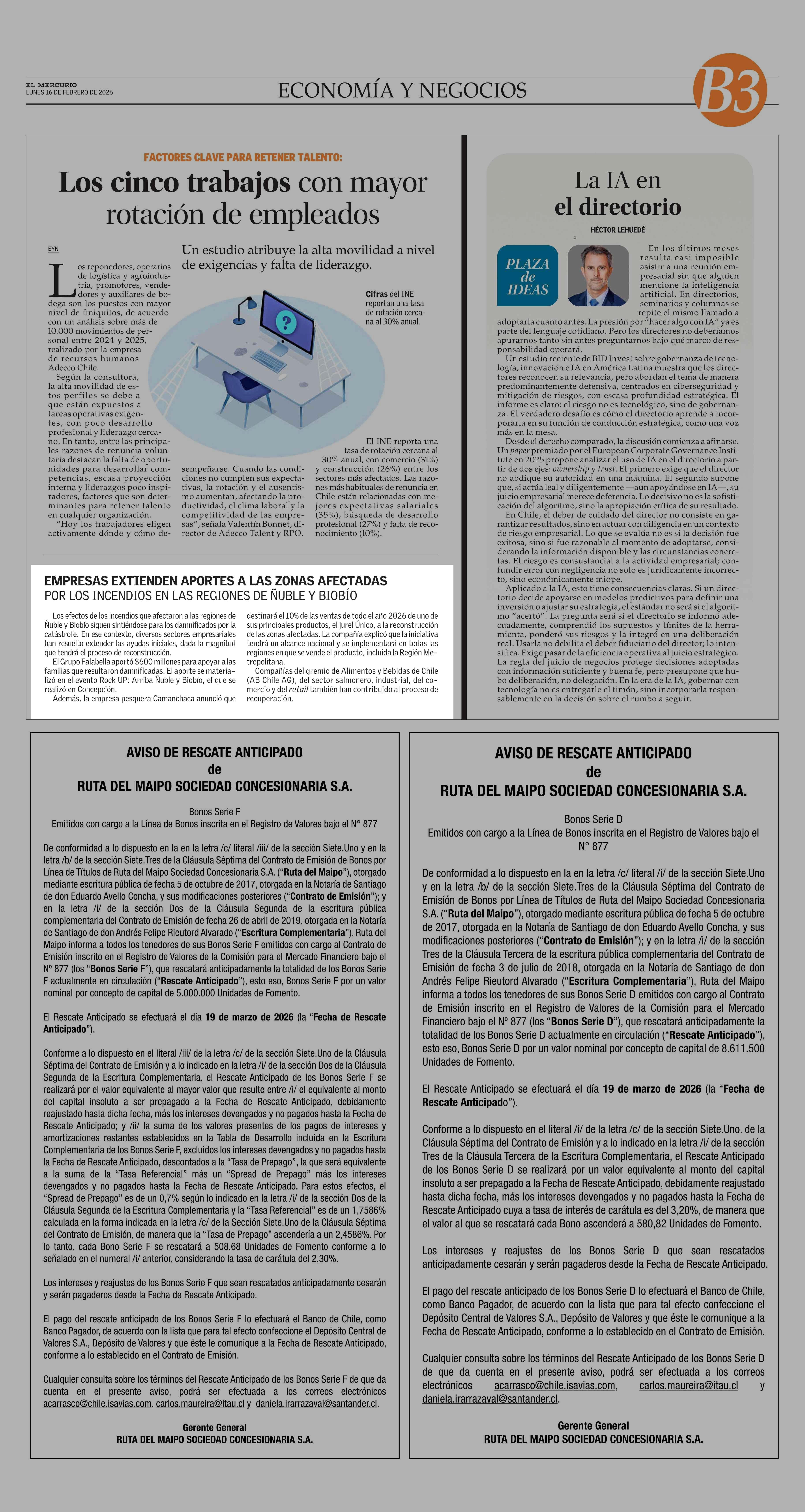 EMPRESAS EXTIENDEN APORTES A LAS ZONAS AFECTADAS POR LOS INCENDIOS EN LAS REGIONES DE ÑUBLE Y BIOBÍO 16-02-2026 El Mercurio |