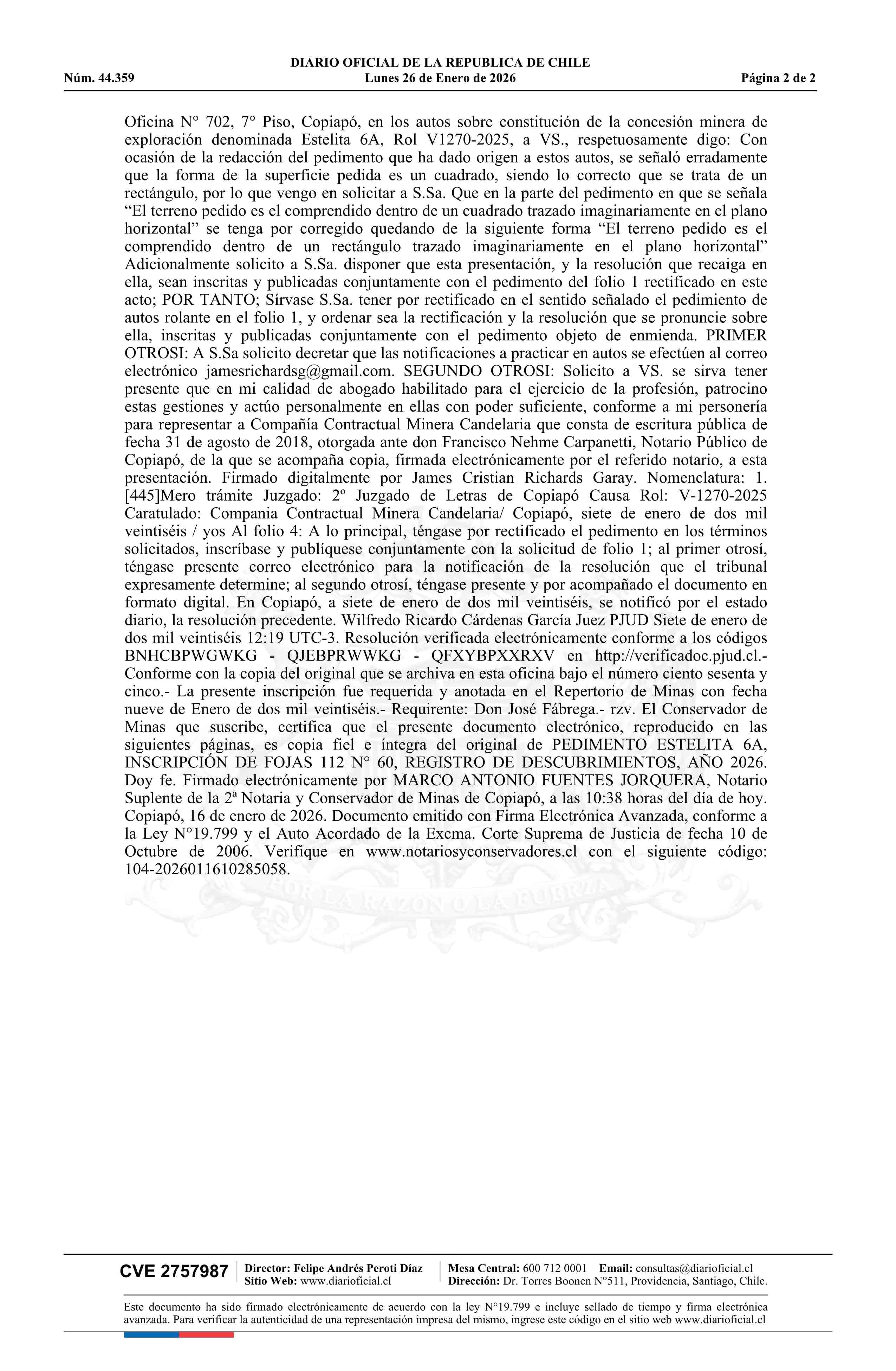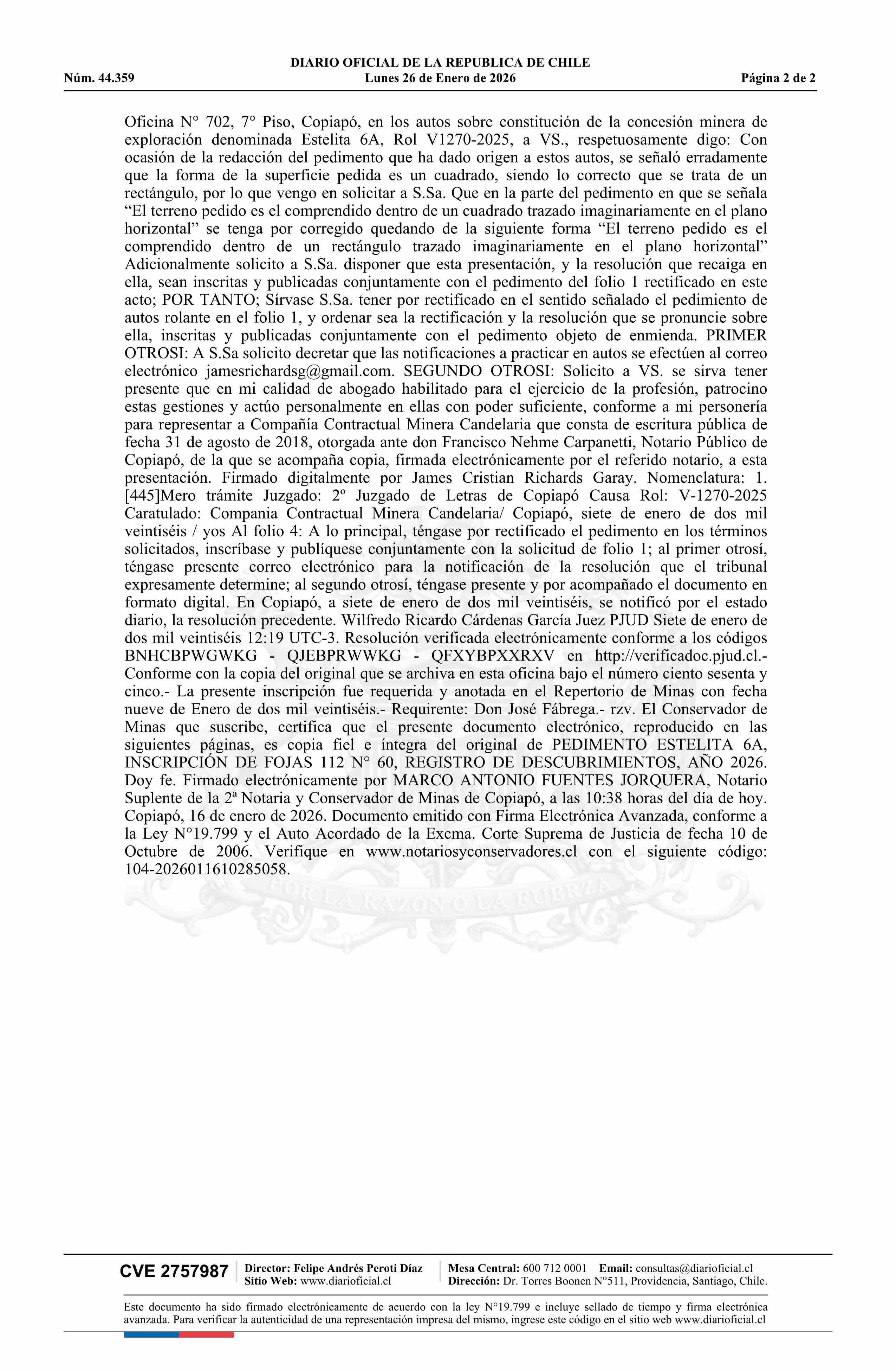 26-01-2026 DIARIO OFICIAL CHILE - BOLETÍN OFICIAL DE MINERÍA