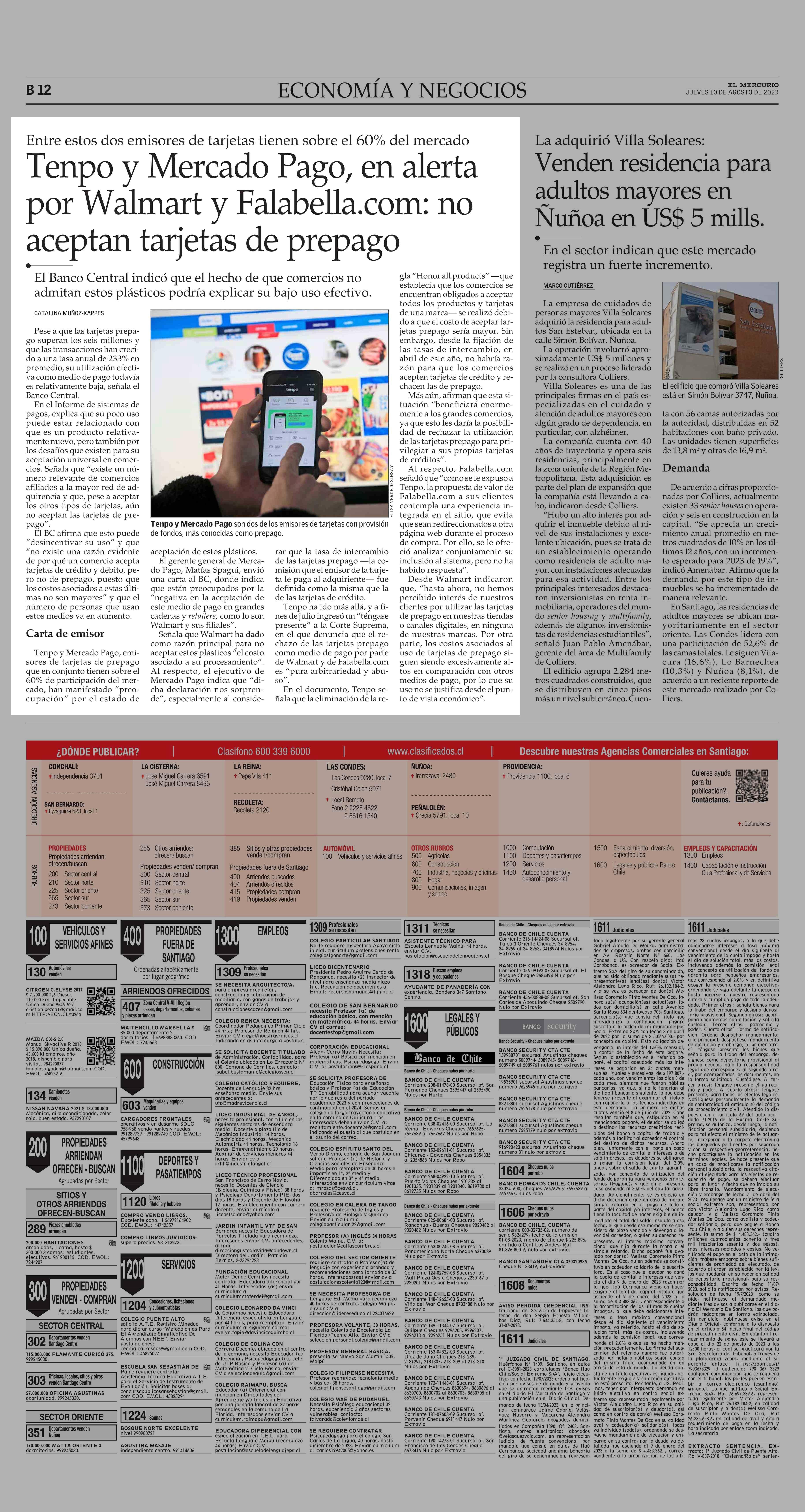 Tenpo y Mercado Pago, en alerta por Walmart y Falabella.com: no aceptan tarjetas de prepago 10-08-2023 El Mercurio |
